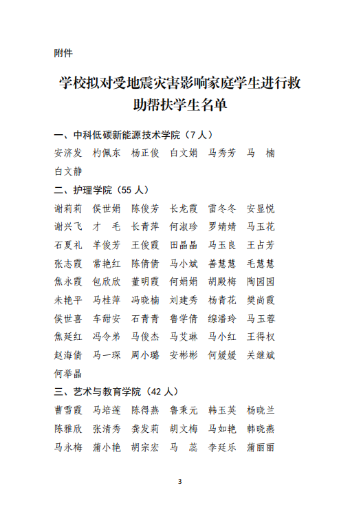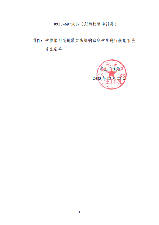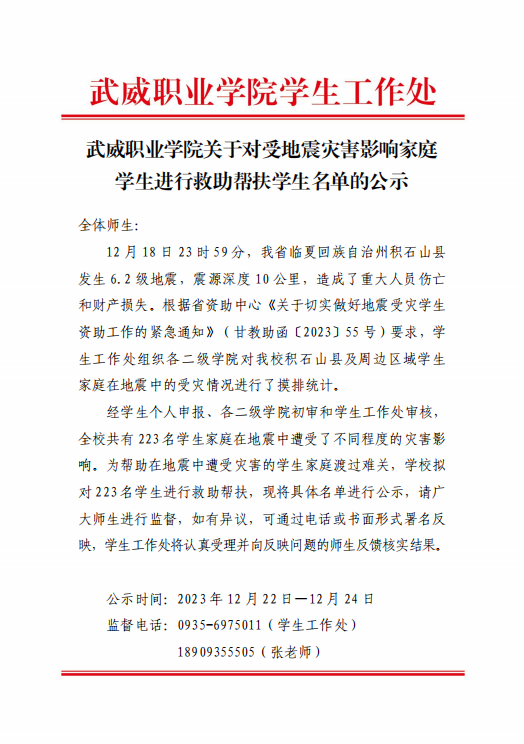 武威職業(yè)學院關(guān)于對受地震災害影響家庭學生進行救助幫扶學生名單的公示