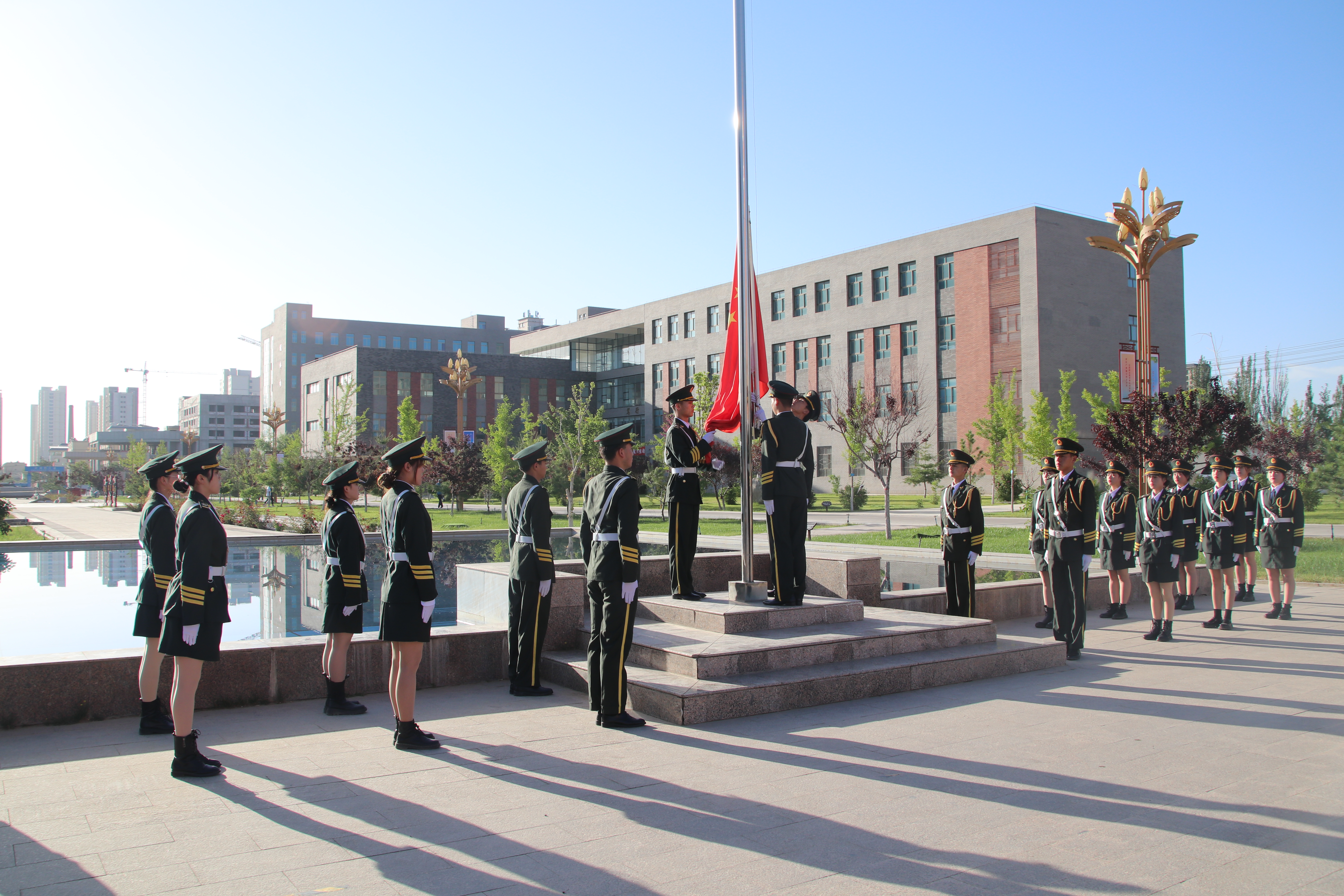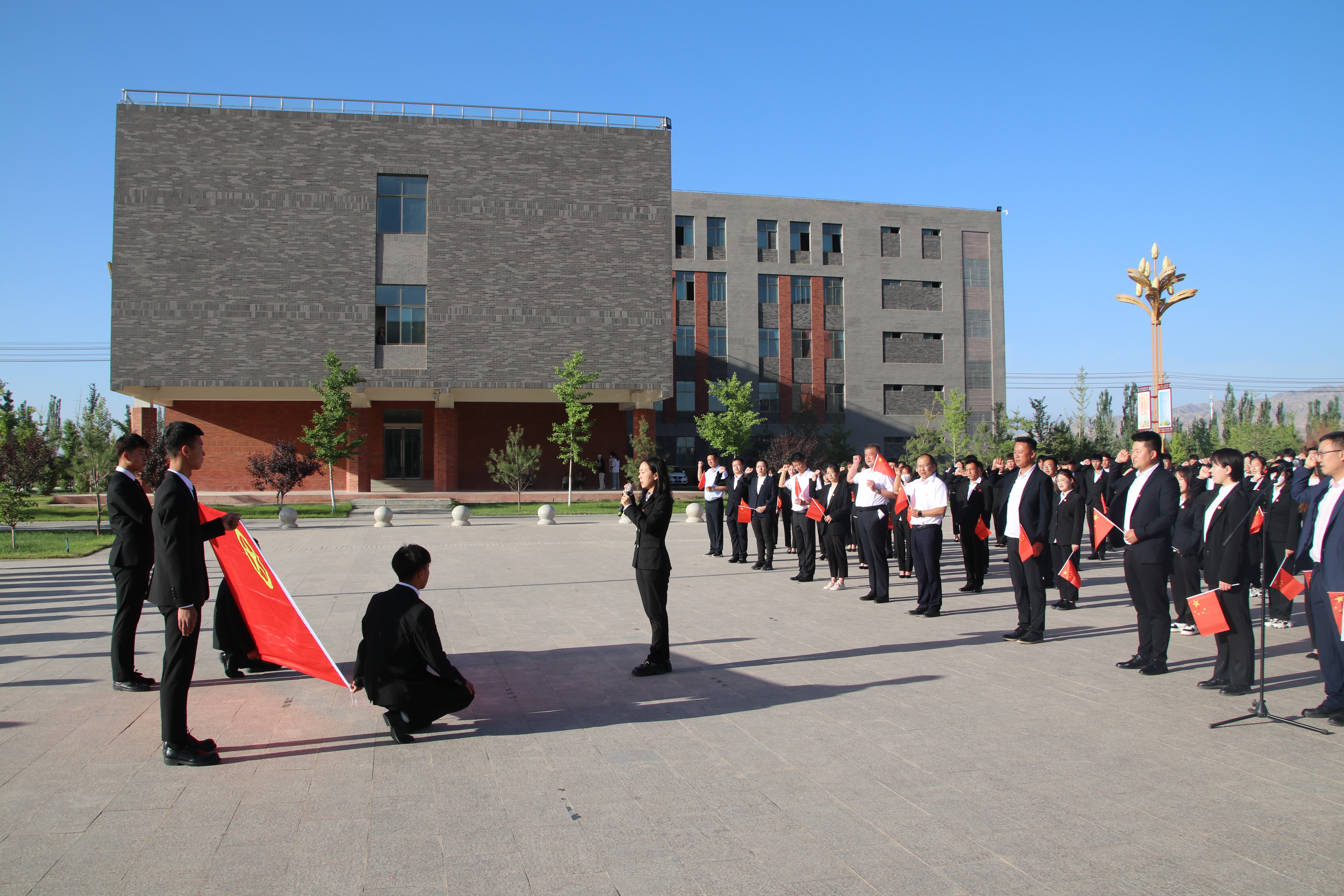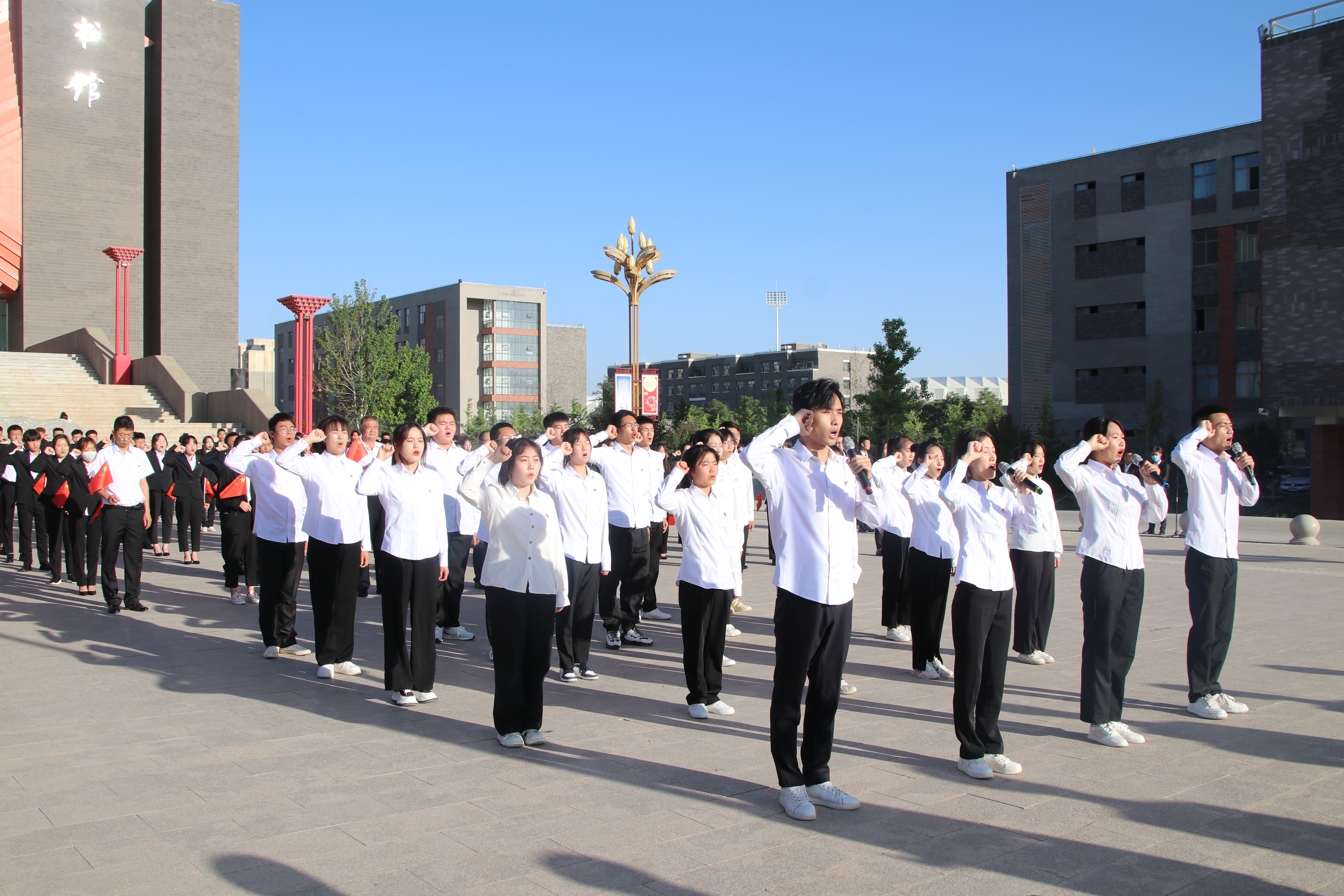 迎著朝陽,五星紅旗在國旗護衛(wèi)隊的護送下緩緩入場,昂昂國歌奏響,國旗迎風飄揚,全場師生齊唱國歌。學生代表在國旗下致獻詞,對黨許下青春的誓言,獻詞之后舉行了嚴肅莊重的重溫入團誓詞儀式,增強了共青團員的組織光榮感和歸屬感,激發(fā)了團員青年的使命感和責任感。最后,全體團員青年齊唱《共青團團歌》,用響亮的歌聲表達建團百年再出發(fā)的祝福,現(xiàn)場愛國熱情持續(xù)高漲。