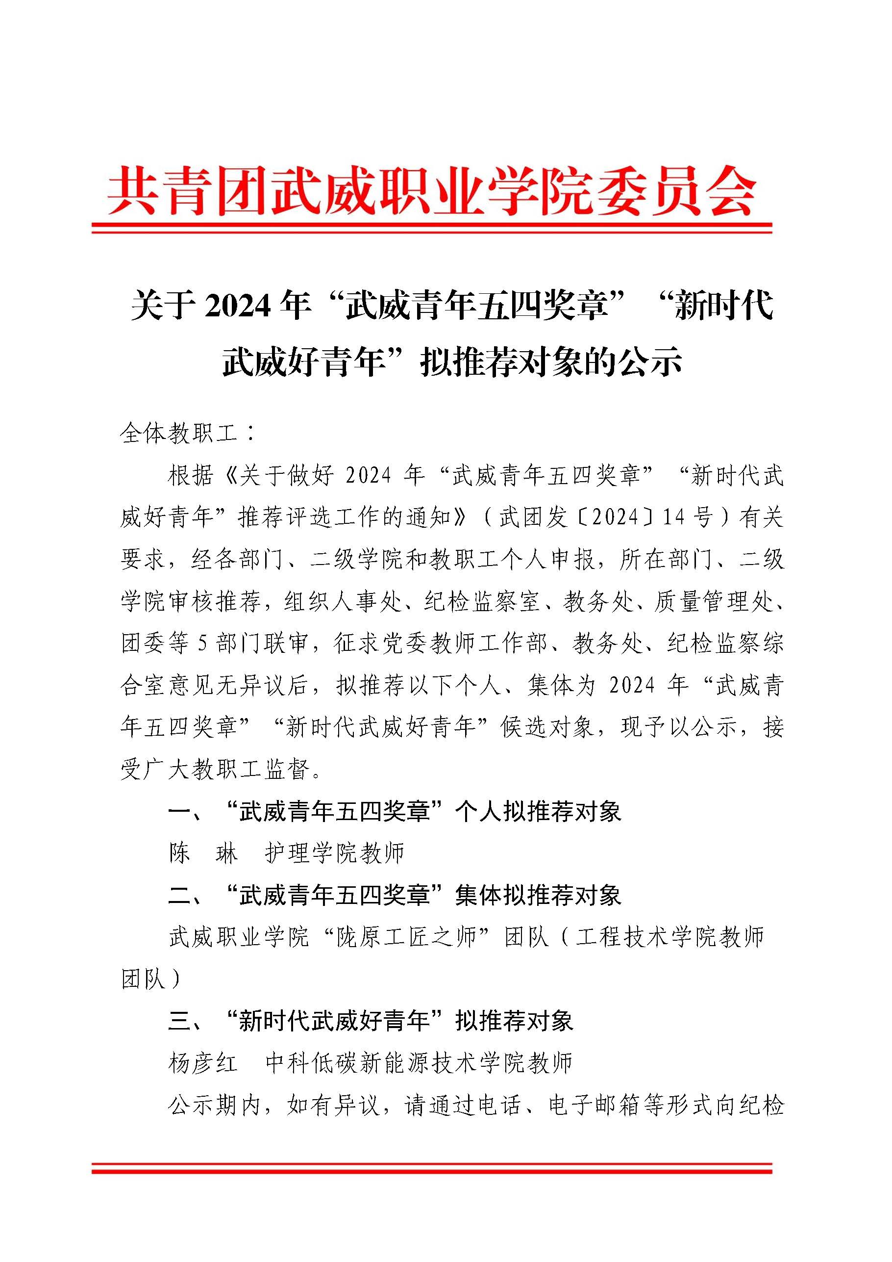 關(guān)于2024年“武威青年五四獎?wù)隆啊毙聲r代武威好青年“擬推薦對象的公示