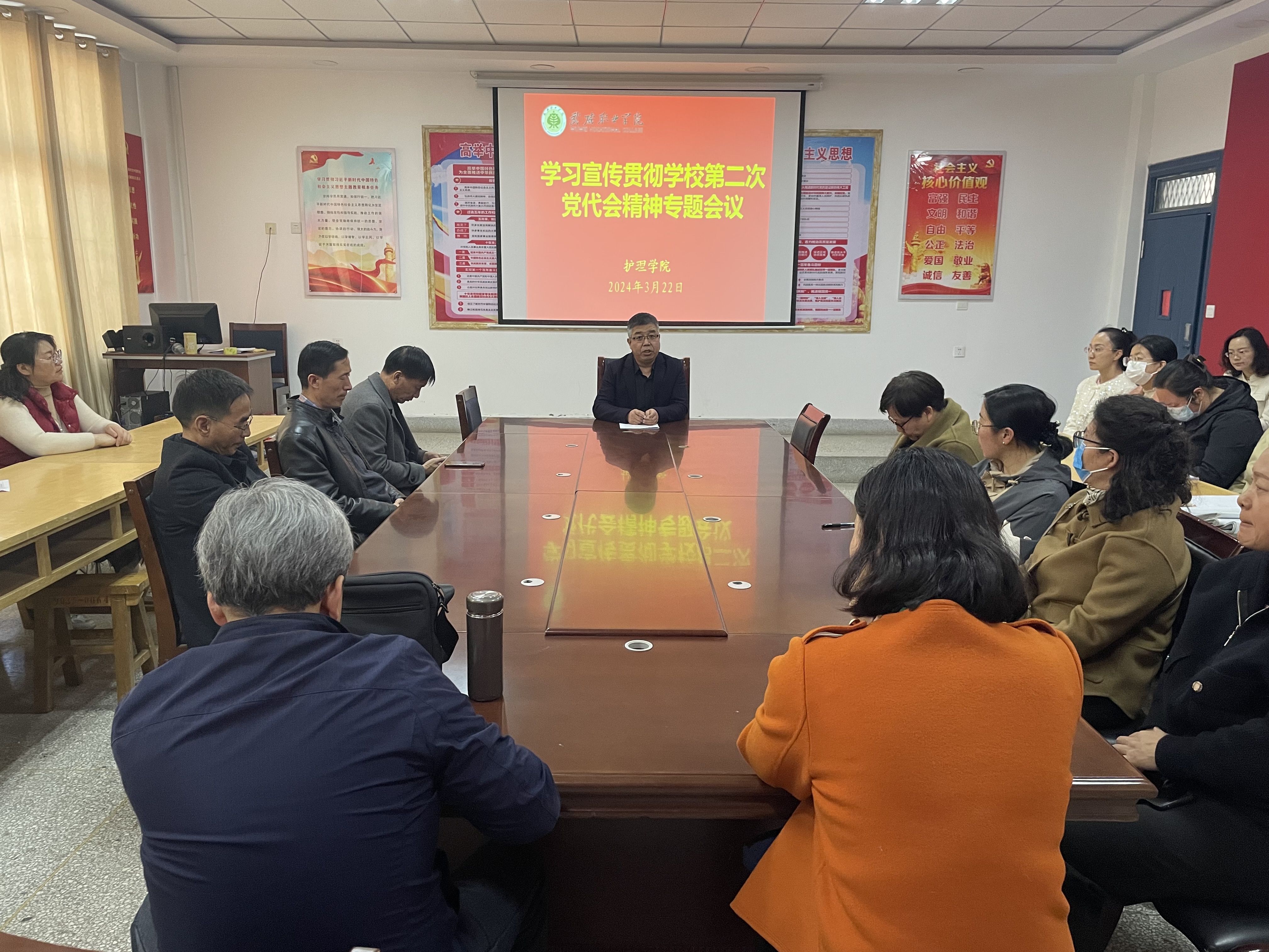 中國(guó)共產(chǎn)黨武威職業(yè)學(xué)院第二次代表大會(huì)的勝利召開(kāi),在護(hù)理學(xué)院廣大教職工中引起了熱烈反響。根據(jù)學(xué)校黨委要求,3月22日,護(hù)理學(xué)院召開(kāi)全體教職工會(huì)議,專題學(xué)習(xí)宣傳貫徹學(xué)校第二次黨代會(huì)精神,會(huì)議由黨總支書記張建輝主持。