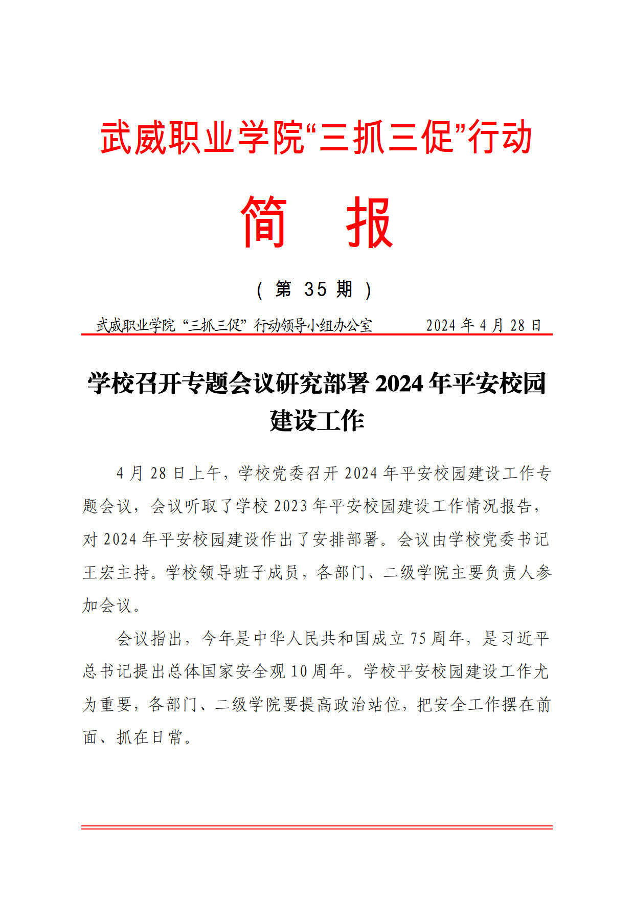 簡(jiǎn)報(bào)第35期:學(xué)校召開(kāi)專(zhuān)題會(huì)議研究部署2024年平安校園建設(shè)工作