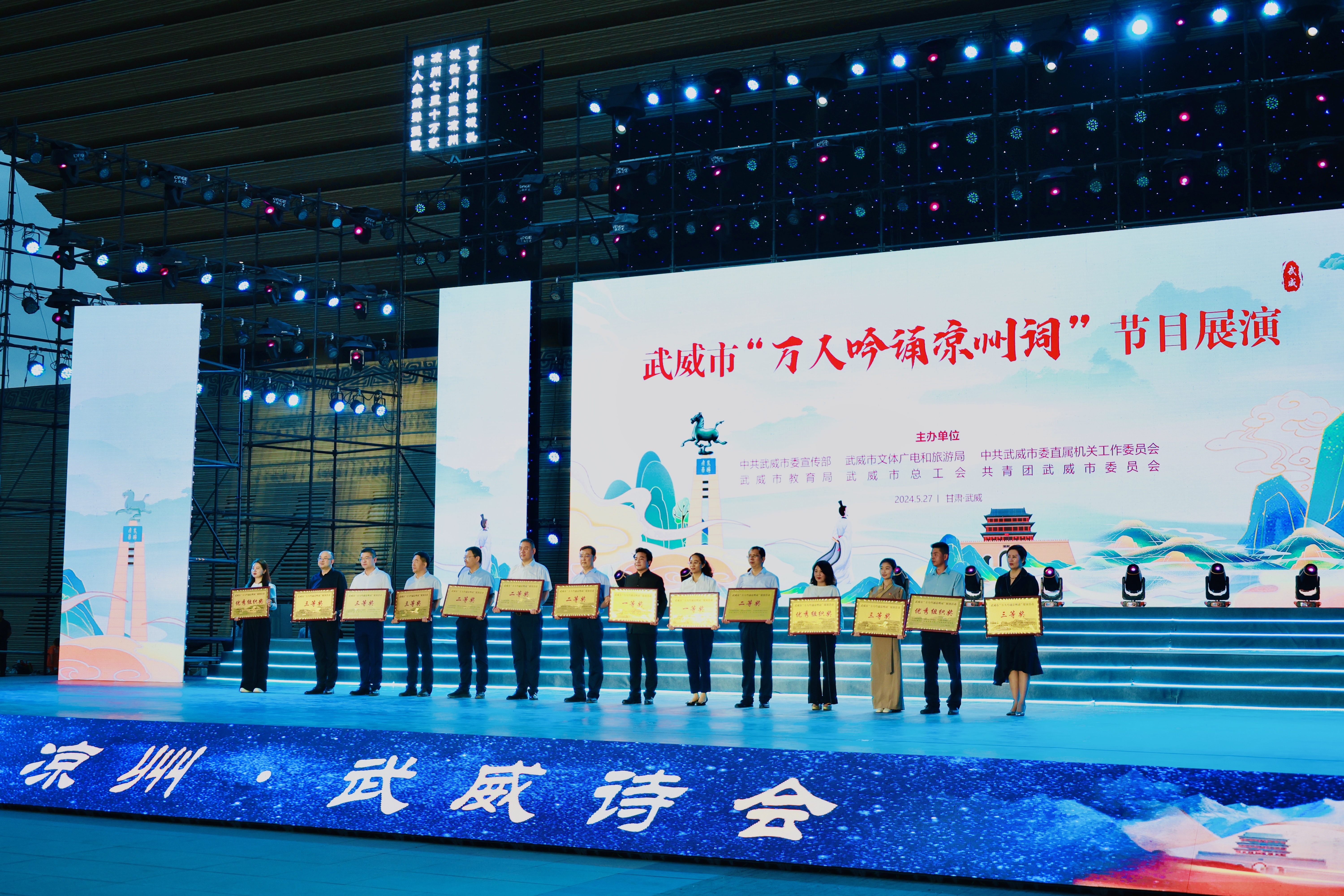 5月27日晚,武威市“萬人吟誦涼州詞”優(yōu)秀節(jié)目展演活動在漢唐天馬城大漢賦館前舉行。我院編排的節(jié)目《詩意涼州·迤邐踏歌》榮獲一等獎。