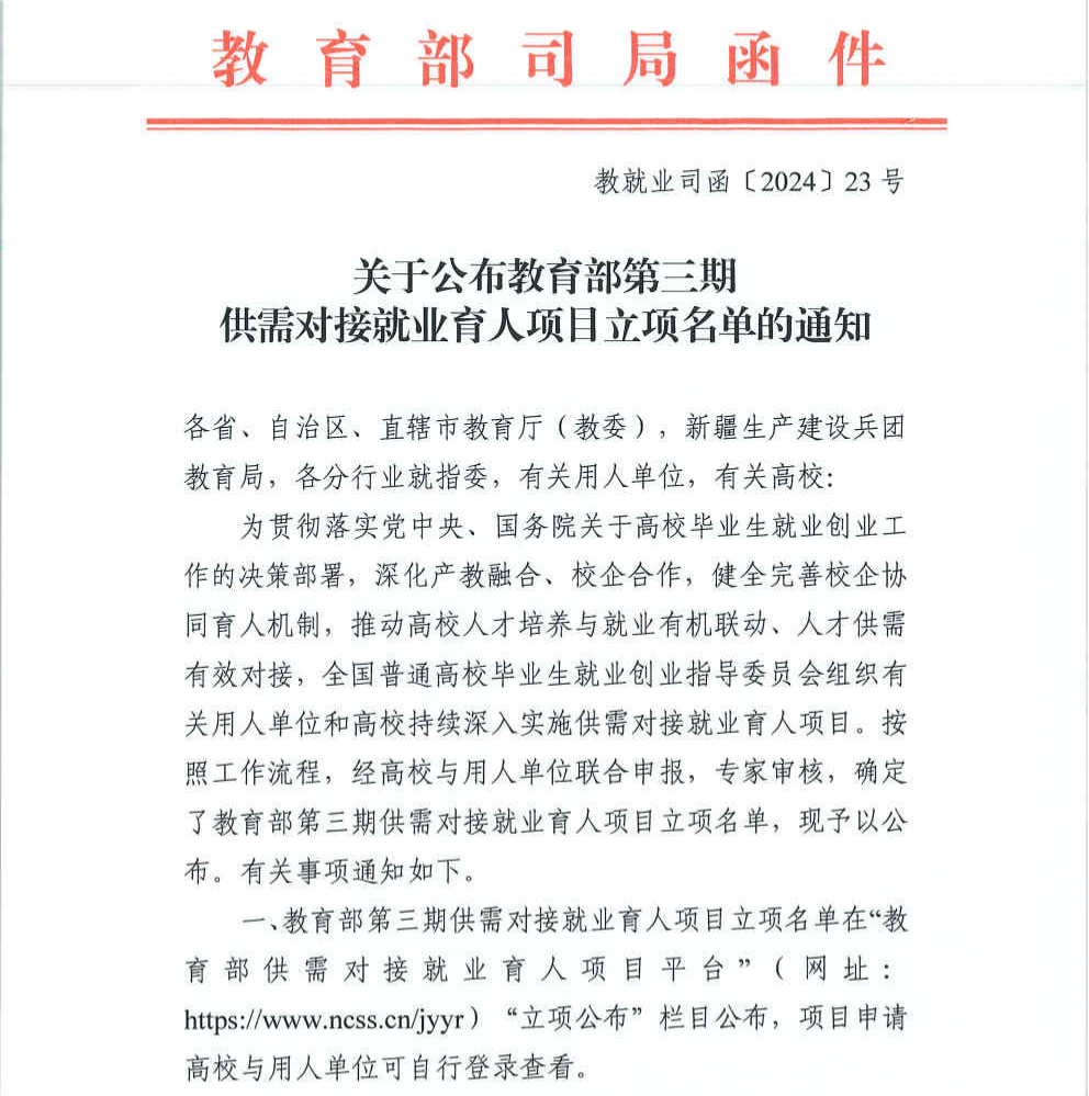 供需對(duì)接就業(yè)育人項(xiàng)目是教育部貫徹落實(shí)黨中央、國(guó)務(wù)院“穩(wěn)就業(yè)”“保就業(yè)”決策部署的舉措之一,旨在深化產(chǎn)教融合、校企合作,推動(dòng)人才培養(yǎng)與就業(yè)有機(jī)聯(lián)動(dòng)、人才供需有效對(duì)接的有效途徑。供需對(duì)接就業(yè)育人項(xiàng)目由高校和用人單位共同申報(bào),經(jīng)教育部組織專家審核立項(xiàng)。用人單位提供項(xiàng)目專項(xiàng)經(jīng)費(fèi)和資源支持,通過(guò)與高校開展定向人才培養(yǎng)、就業(yè)實(shí)習(xí)等合作,培養(yǎng)更多高素質(zhì)技術(shù)技能型人才。