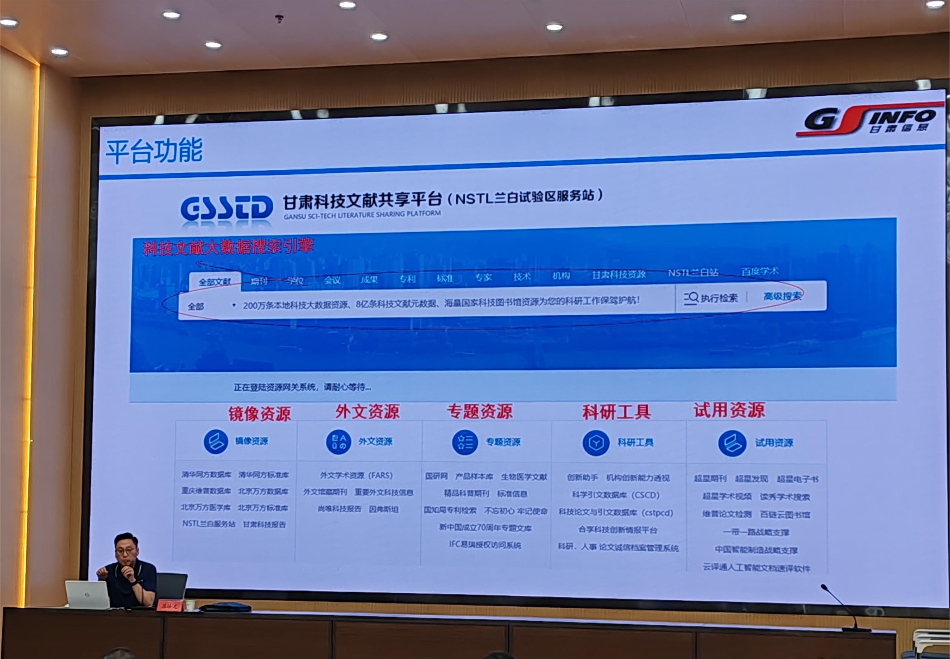 蘇海龍研究員以《如何利用科技文獻(xiàn)提升科研創(chuàng)新能力》為主題開展講座。講座分別從科技文獻(xiàn)的重要性、平臺功能及數(shù)據(jù)資源、醫(yī)學(xué)科研創(chuàng)新與文獻(xiàn)保障、科研相關(guān)問題和實際操作演示幾個方面講述科研項目申報中文獻(xiàn)檢索與文獻(xiàn)查閱的重要性,并介紹了甘肅科技文獻(xiàn)共享平臺,展示了平臺的檢索功能,為大家拓寬了文獻(xiàn)檢索的渠道,提升了教師信息檢索能力。