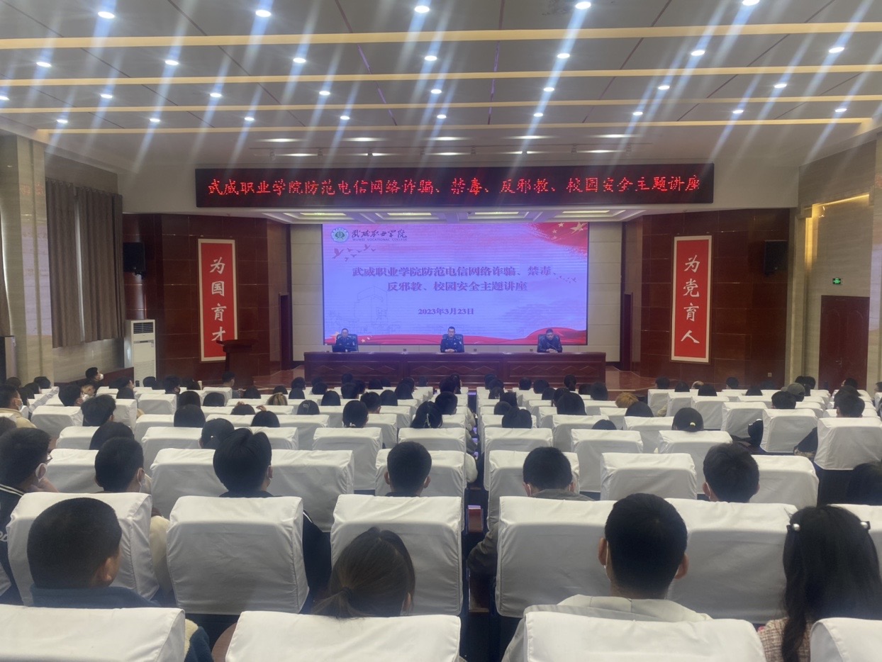 為進一步加強防范電信網(wǎng)絡詐騙、禁毒、反邪教、校園安全宣傳教育工作,提高廣大師生防范意識,3月24日下午,學校安全保衛(wèi)處邀請涼州區(qū)西關派出所民警為學校師生開展防范電信網(wǎng)絡詐騙、禁毒、反邪教、校園安全主題講座。講座由學校安全保衛(wèi)處負責人李欣主持,西關派出所副所長藺福鵬參加講座。