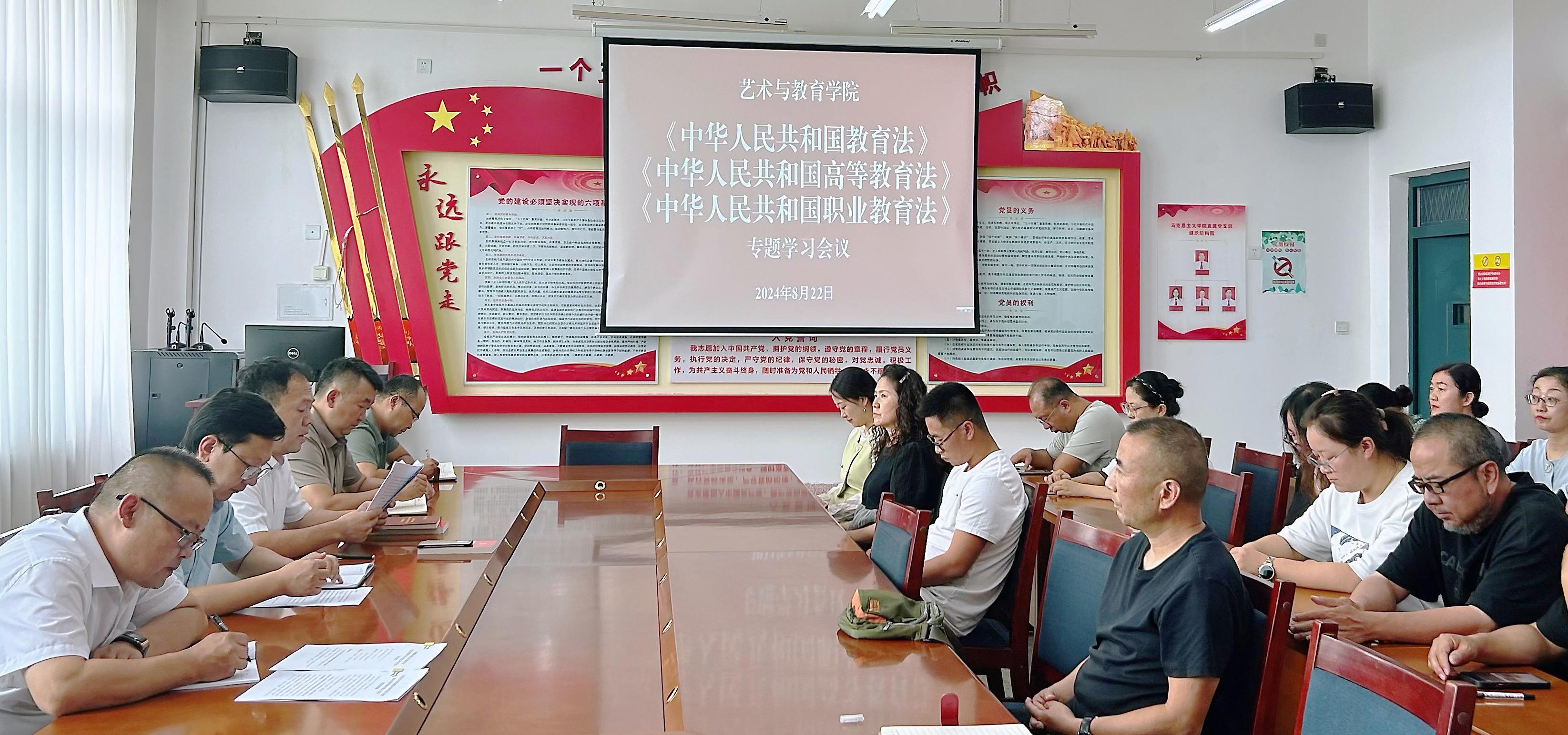 為進(jìn)一步提高教師的法律法規(guī)意識(shí),加強(qiáng)教師的師德師風(fēng)建設(shè),轉(zhuǎn)變觀念、解放思想,樹立現(xiàn)代職業(yè)教育觀念,扎實(shí)推動(dòng)教育教學(xué)工作高質(zhì)量發(fā)展,8月22日下午,藝術(shù)與教育學(xué)院組織全體教職工專題學(xué)習(xí)《中華人民共和國教育法》《中華人民共和國高等教育法》《中華人民共和國職業(yè)教育法》等教育相關(guān)法律法規(guī)及政策文件。會(huì)議由黨總支書記王政主持。