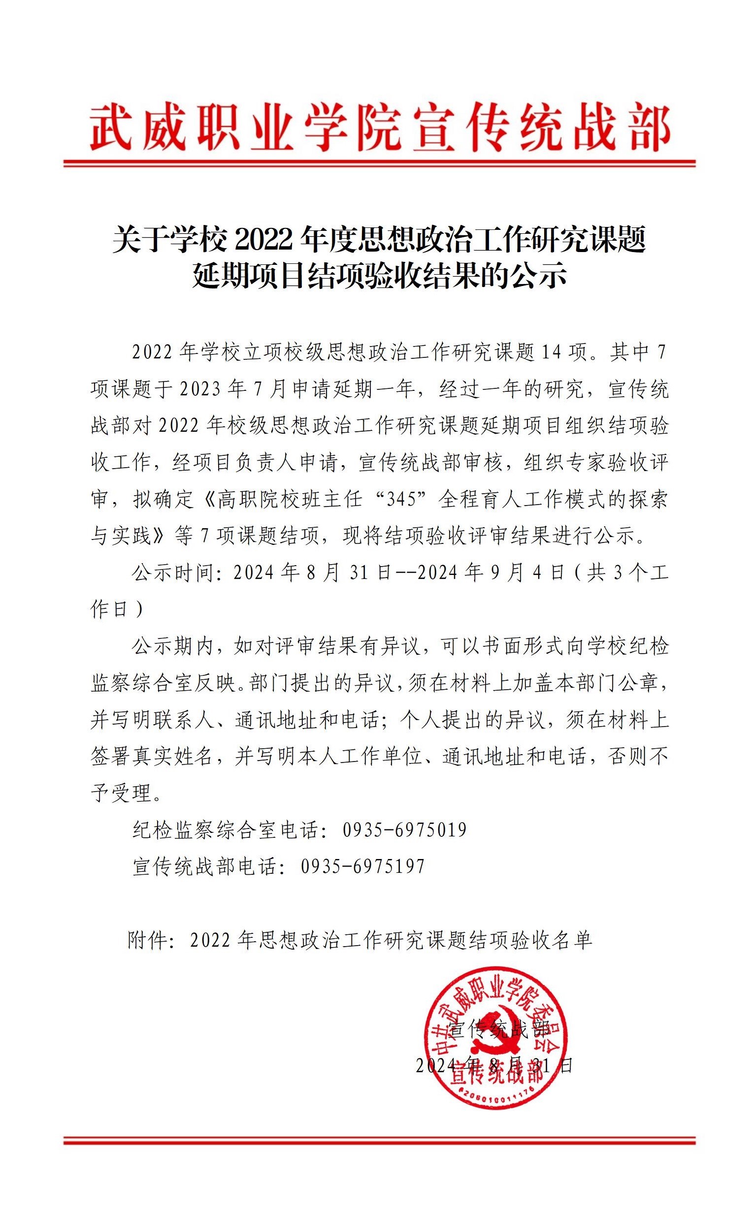 關(guān)于學校2022年度思想政治工作研究課題延期項目結(jié)項驗收結(jié)果的公示