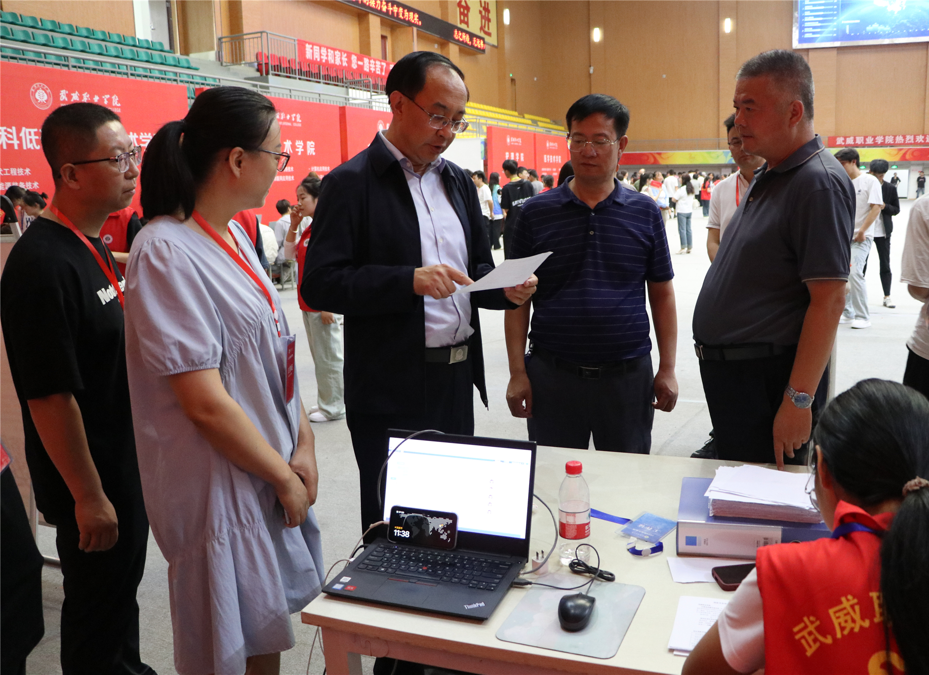 校領(lǐng)導(dǎo)一一走過(guò)新生報(bào)到處、綠色通道、繳費(fèi)處和各二級(jí)學(xué)院迎新報(bào)到點(diǎn),了解新生報(bào)到情況,仔細(xì)詢問(wèn)智慧學(xué)工平臺(tái)使用情況,親切問(wèn)候堅(jiān)守崗位的師生志愿者。在醫(yī)學(xué)技術(shù)學(xué)院報(bào)到點(diǎn)前,王宏與2024級(jí)放射治療技術(shù)(重離子方向)新生及家長(zhǎng)聊了起來(lái)——“歡迎你們來(lái)到武威職業(yè)學(xué)院學(xué)習(xí)!為什么會(huì)報(bào)考這個(gè)專業(yè)?”在得知學(xué)生家庭中有人從事重離子醫(yī)療領(lǐng)域的研發(fā)工作時(shí),王宏勉勵(lì)新生要努力學(xué)好專業(yè)、練好技能,爭(zhēng)做高素質(zhì)技術(shù)技能人才。在家長(zhǎng)休息區(qū),王宏與來(lái)自甘肅慶陽(yáng)的新生家長(zhǎng)親切交談,并介紹了學(xué)校的辦學(xué)情況,建議學(xué)生和家長(zhǎng)在校園里走一走看一看,多了解熟悉學(xué)校,幫助學(xué)生盡快適應(yīng)大學(xué)生活,并祝愿學(xué)生家長(zhǎng)在武期間,一切順利。
