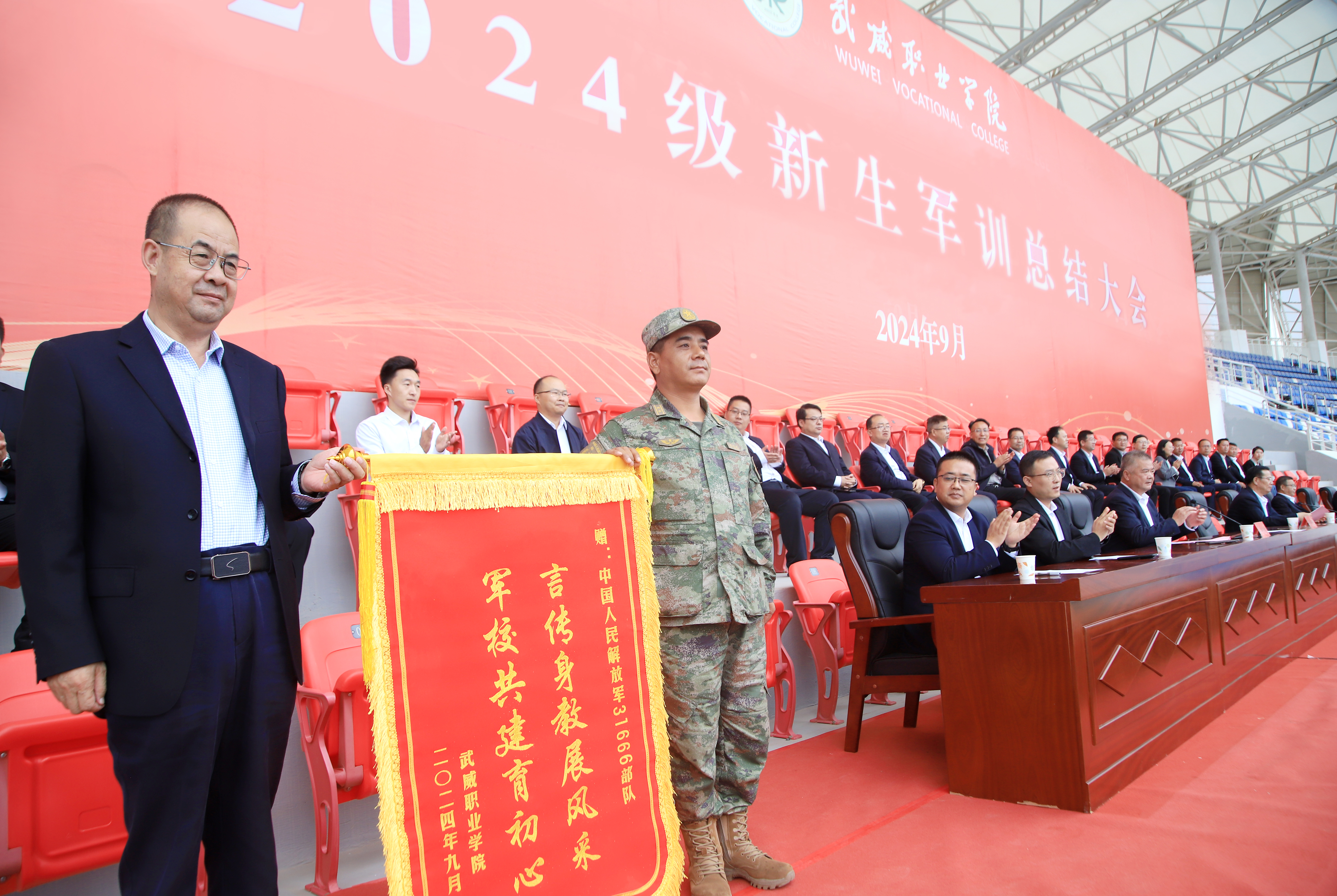 金秋的校園青春閃亮,挺拔的軍姿威嚴(yán)豪放。9月18日下午,學(xué)校2024級新生軍訓(xùn)總結(jié)大會在體育場隆重舉行。校長、黨委副書記張開禮,黨委副書記翟存祥,黨委委員、紀(jì)委書記、監(jiān)察專員陳曉煜,31666部隊陸軍中校謝紹璞出席大會。會議由黨委委員、副校長王守云主持。