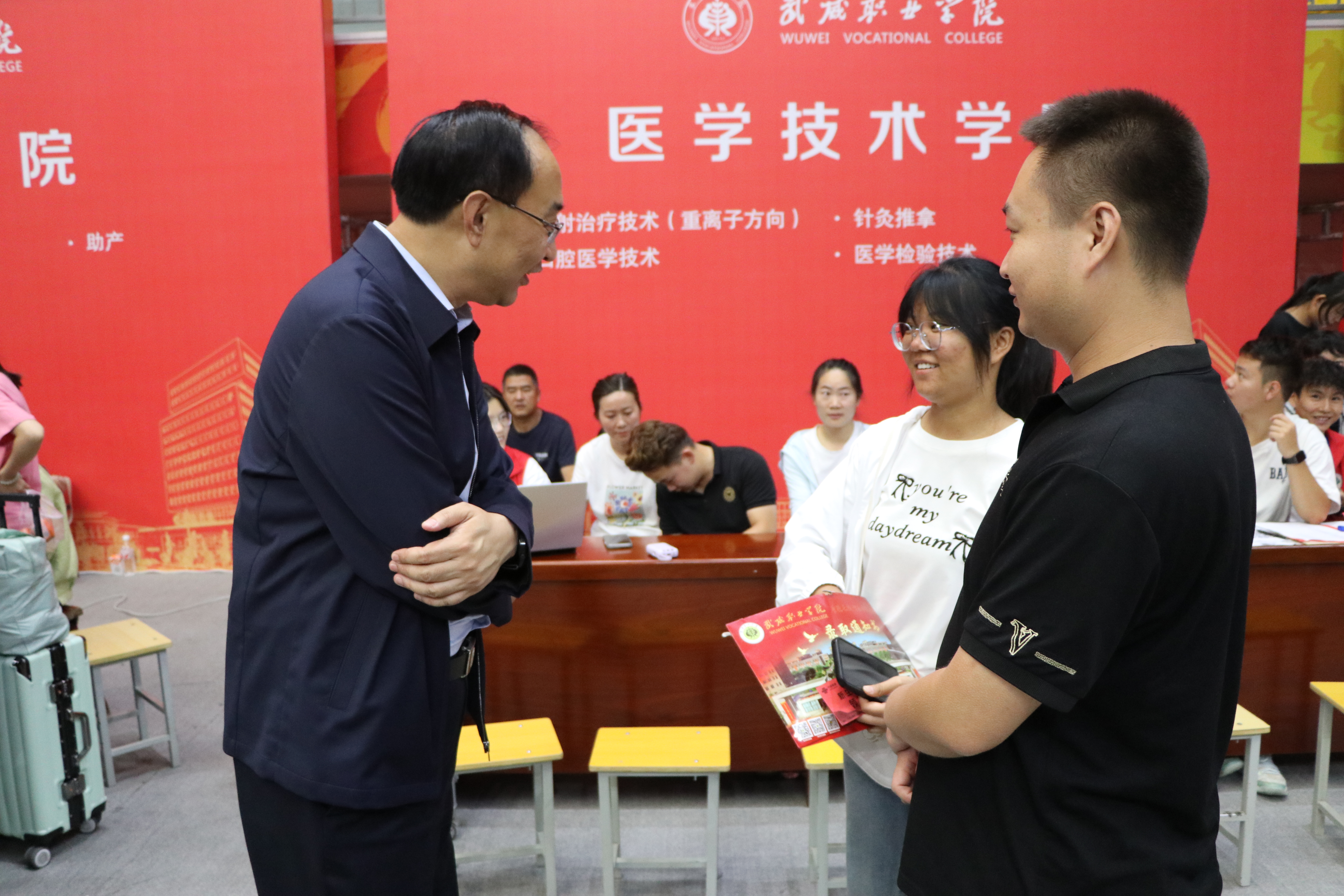 校領導一一走過新生報到處、綠色通道、繳費處和各二級學院迎新報到點,了解新生報到情況,仔細詢問智慧學工平臺使用情況,親切問候堅守崗位的師生志愿者。在醫(yī)學技術學院報到點前,王宏與2024級放射治療技術(重離子方向)新生及家長聊了起來——“歡迎你們來到武威職業(yè)學院學習!為什么會報考這個專業(yè)?”在得知學生家庭中有人從事重離子醫(yī)療領域的研發(fā)工作時,王宏勉勵新生要努力學好專業(yè)、練好技能,爭做高素質技術技能人才。在家長休息區(qū),王宏與來自甘肅慶陽的新生家長親切交談,并介紹了學校的辦學情況,建議學生和家長在校園里走一走看一看,多了解熟悉學校,幫助學生盡快適應大學生活,并祝愿學生家長在武期間,一切順利。
