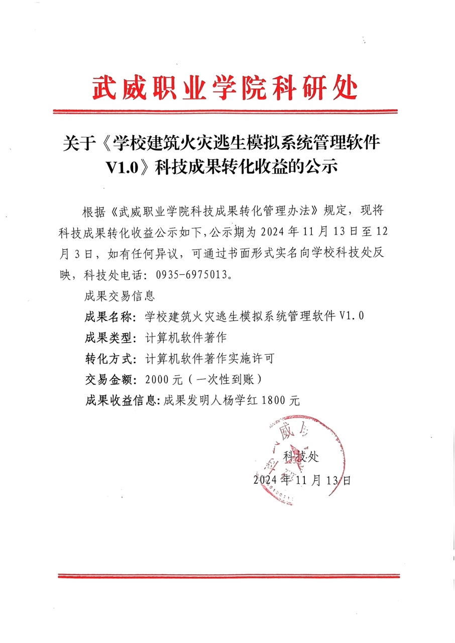 關(guān)于《學校建筑火災逃生模擬系統(tǒng)管理軟件V1.0》科技成果轉(zhuǎn)化收益的公示