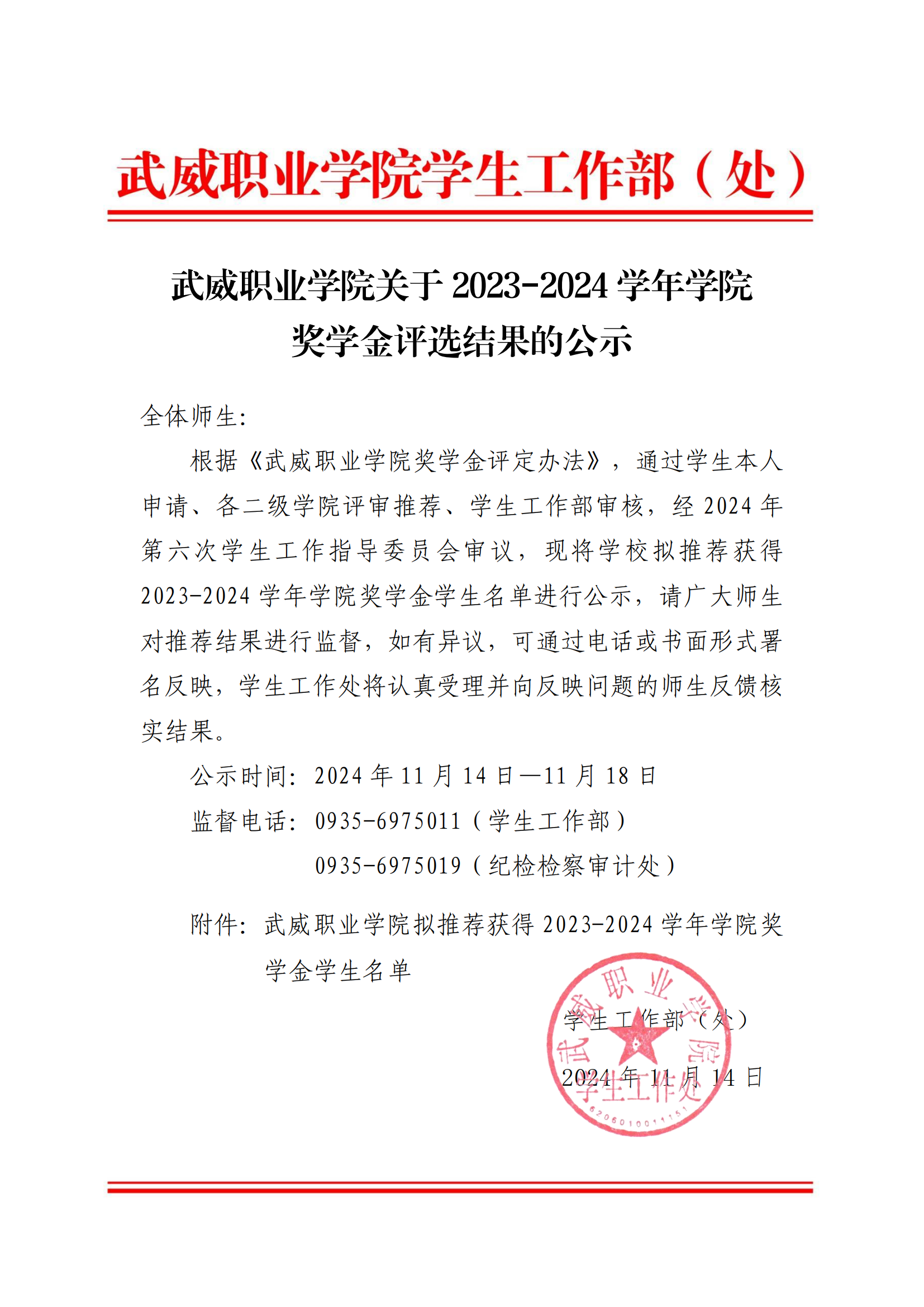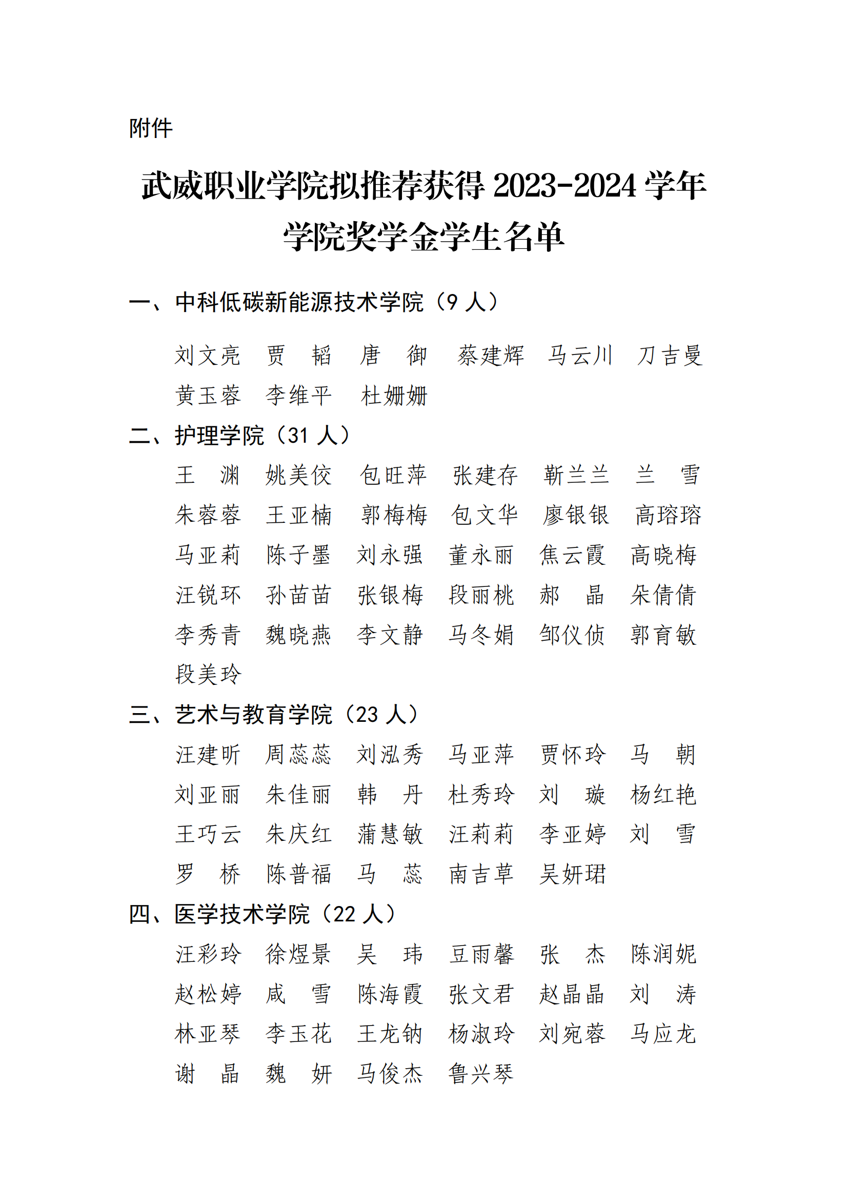武威職業(yè)學(xué)院關(guān)于2023-2024學(xué)年學(xué)院獎(jiǎng)學(xué)金評選結(jié)果的公示