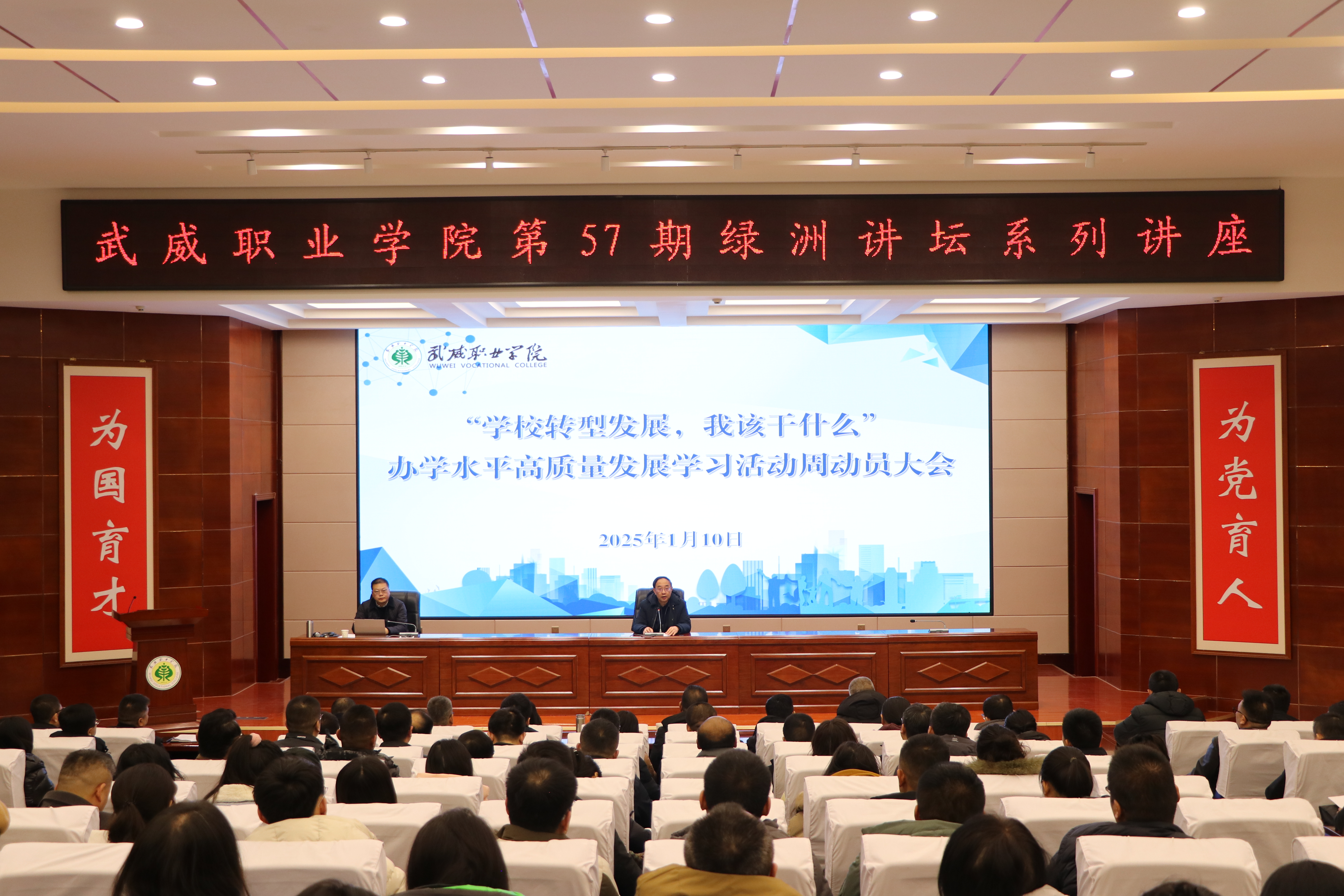 1月10日下午,學校第五十七期綠洲講壇暨辦學水平高質量發(fā)展學習活動周動員大會在菁英廳順利啟動,學校領導、中層管理干部、教研室主任及教師代表共210余人參加了活動。黨委副書記翟存祥主持活動。