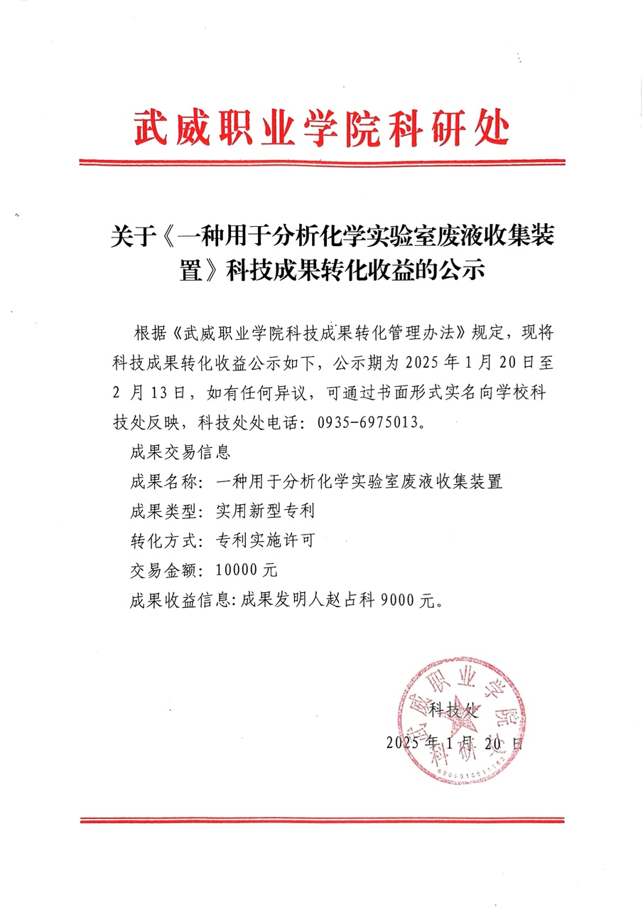 關(guān)于《一種用于分析化學(xué)實(shí)驗(yàn)室廢液收集裝置》科技成果轉(zhuǎn)化收益的公示