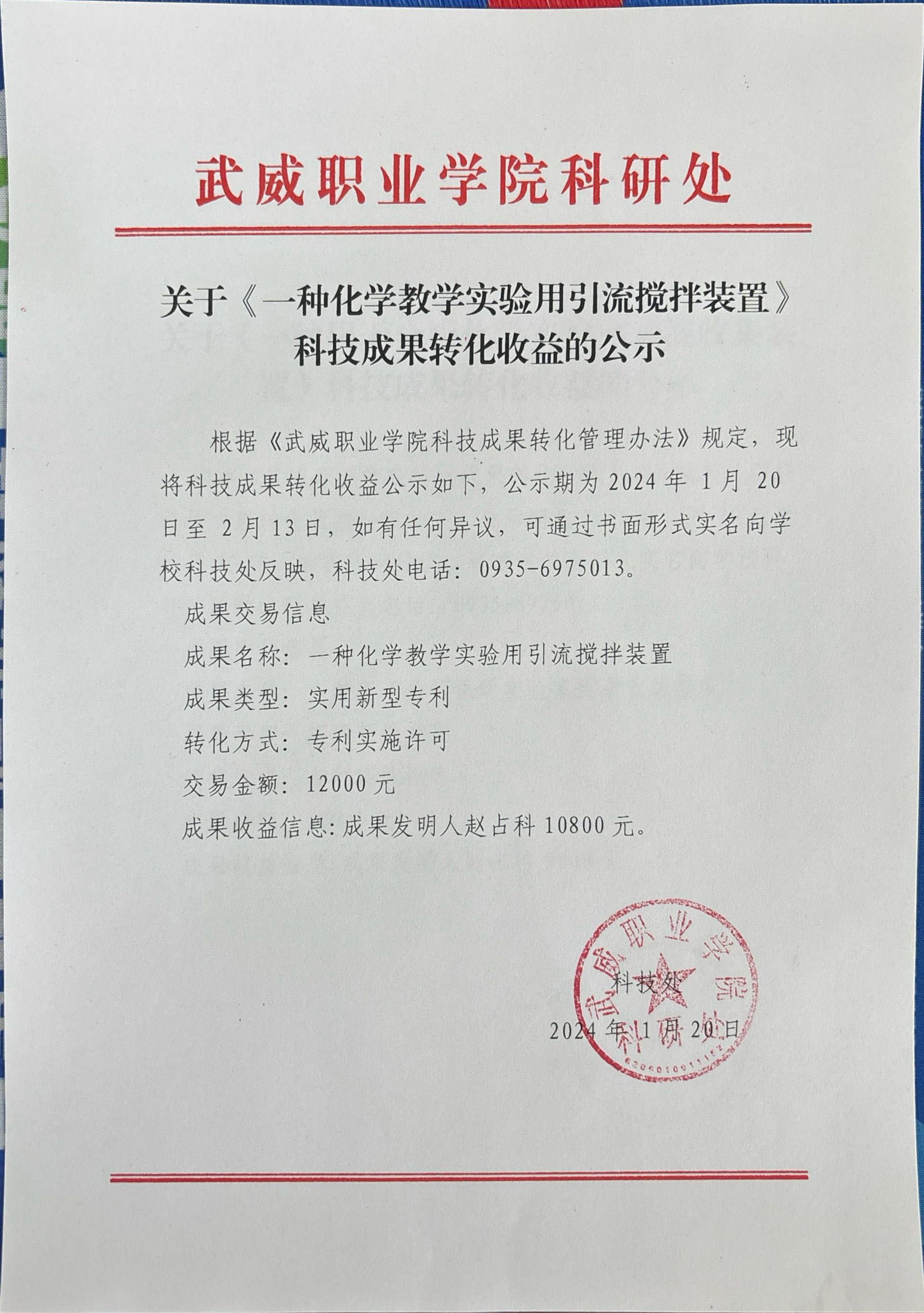 關(guān)于《一種化學(xué)教學(xué)實(shí)驗(yàn)用引流攪拌裝置》科技成果轉(zhuǎn)化收益的公示