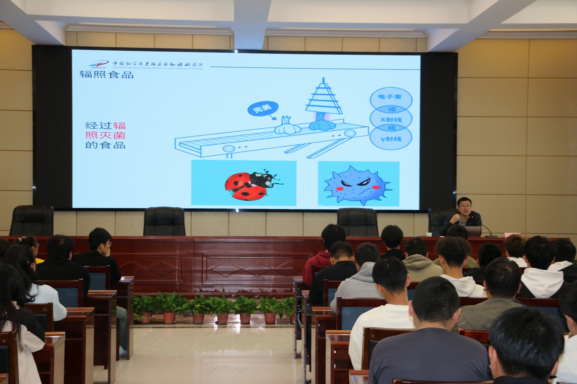 李吉豪做了題為《身入“輻”境,洞悉其益——輻照技術(shù),點亮生活之光》的報告,從輻射技術(shù)概述科普、輻照技術(shù)在農(nóng)業(yè)領(lǐng)域的應(yīng)用、輻照技術(shù)在高分子化工領(lǐng)域的應(yīng)用等三個方面對輻照技術(shù)的前沿應(yīng)用進(jìn)行了生動的講解,現(xiàn)場師生大受裨益,也讓學(xué)生對自己所學(xué)相關(guān)專業(yè)有了更加深刻的理解,同時激發(fā)了同學(xué)們對專業(yè)知識的學(xué)習(xí)熱情。