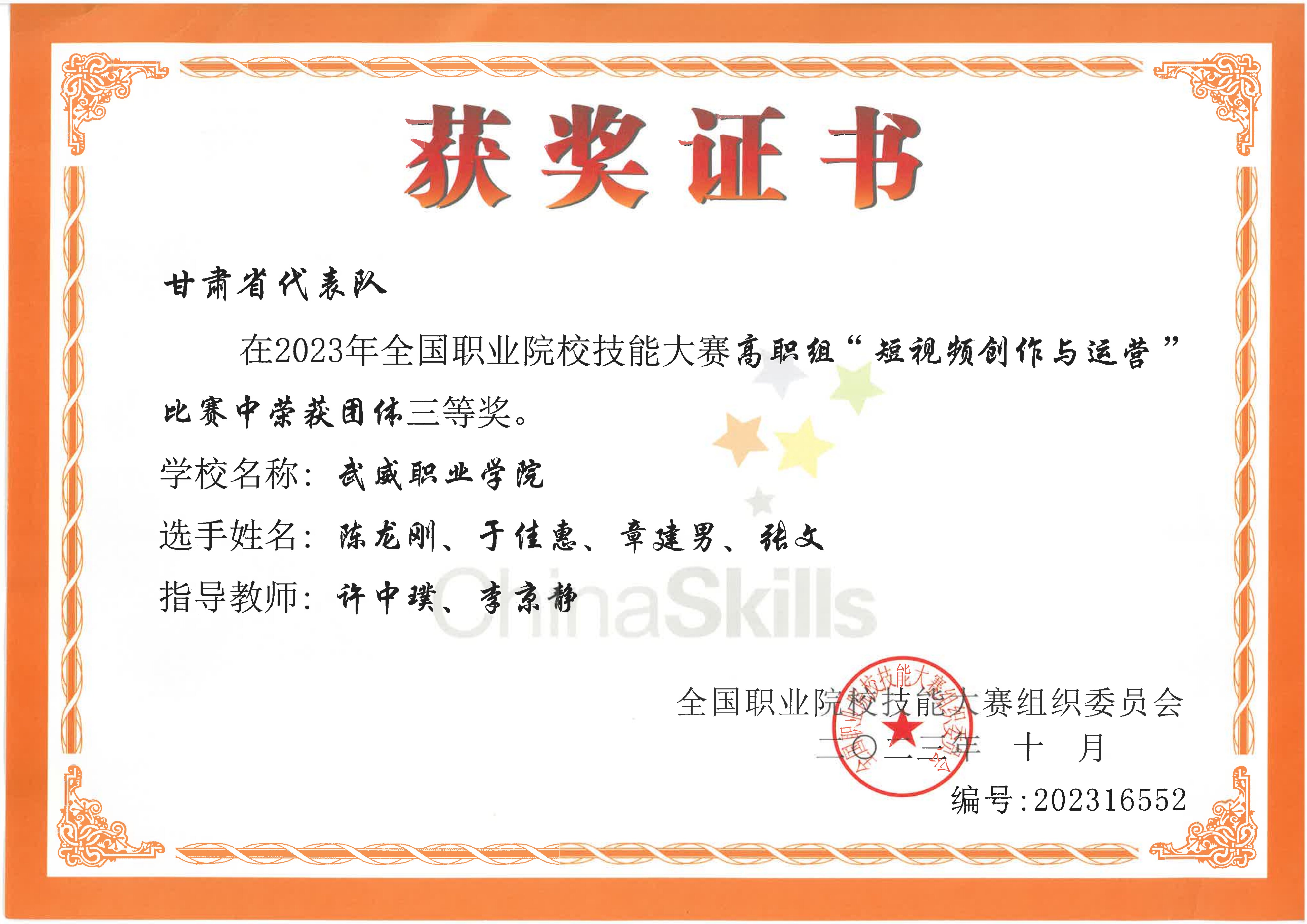 學(xué)生獲2023年全國職業(yè)院校技能大賽高職組短視頻創(chuàng)作與運(yùn)營三等獎