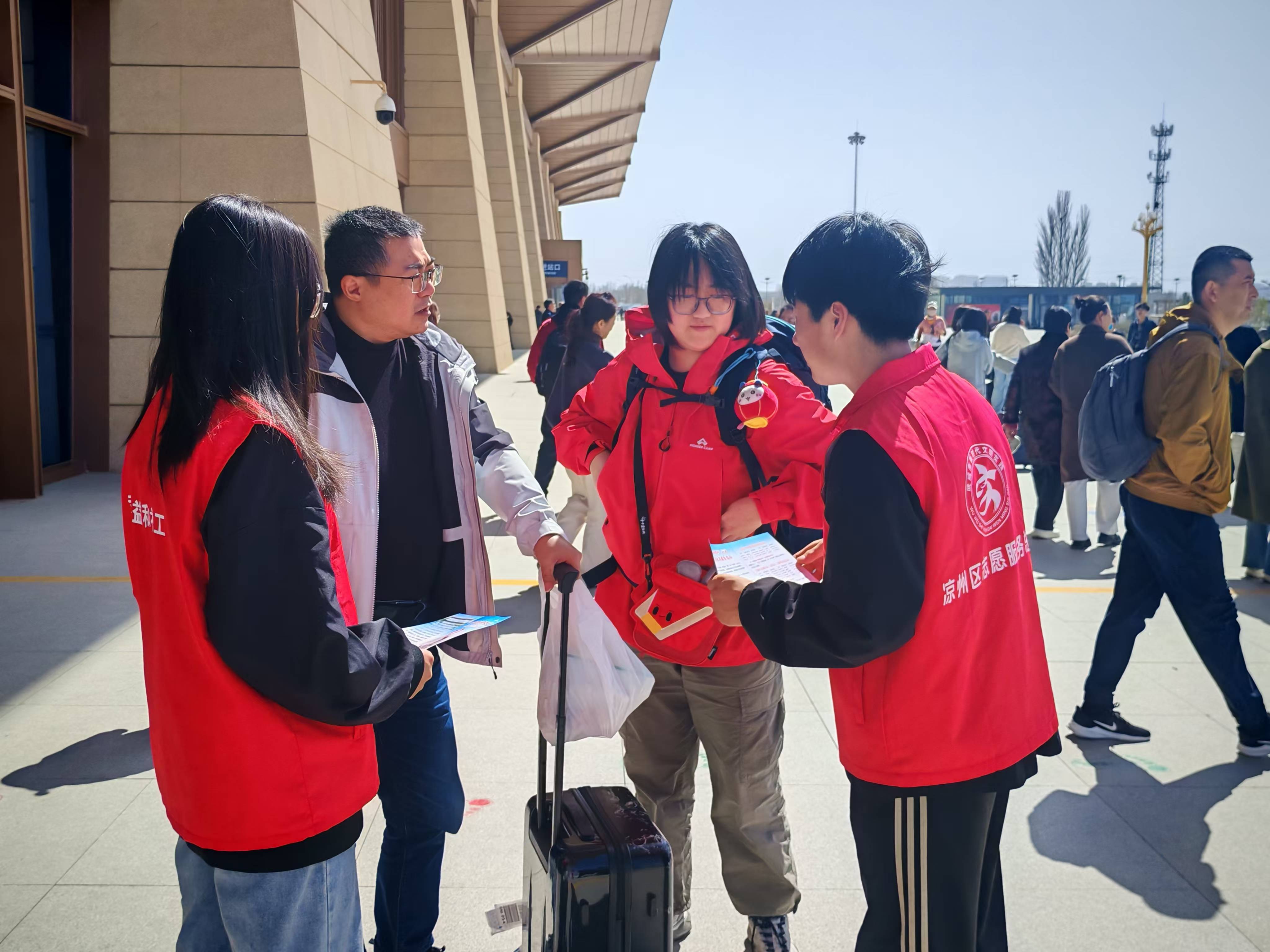 在志愿服務站點,志愿者們身穿紅馬甲,化身“沙漠綠洲向?qū)А?,?gòu)成一道暖心風景線。他們熱情地為遠道而來的全國各地植樹志愿者們提供暖心引導,熱情細致告知前往民勤的乘車路線、換乘信息和注意事項,并協(xié)助搬運行李,引導植樹志愿者們有序乘車,用實際行動詮釋了新時代青年的責任與擔當。