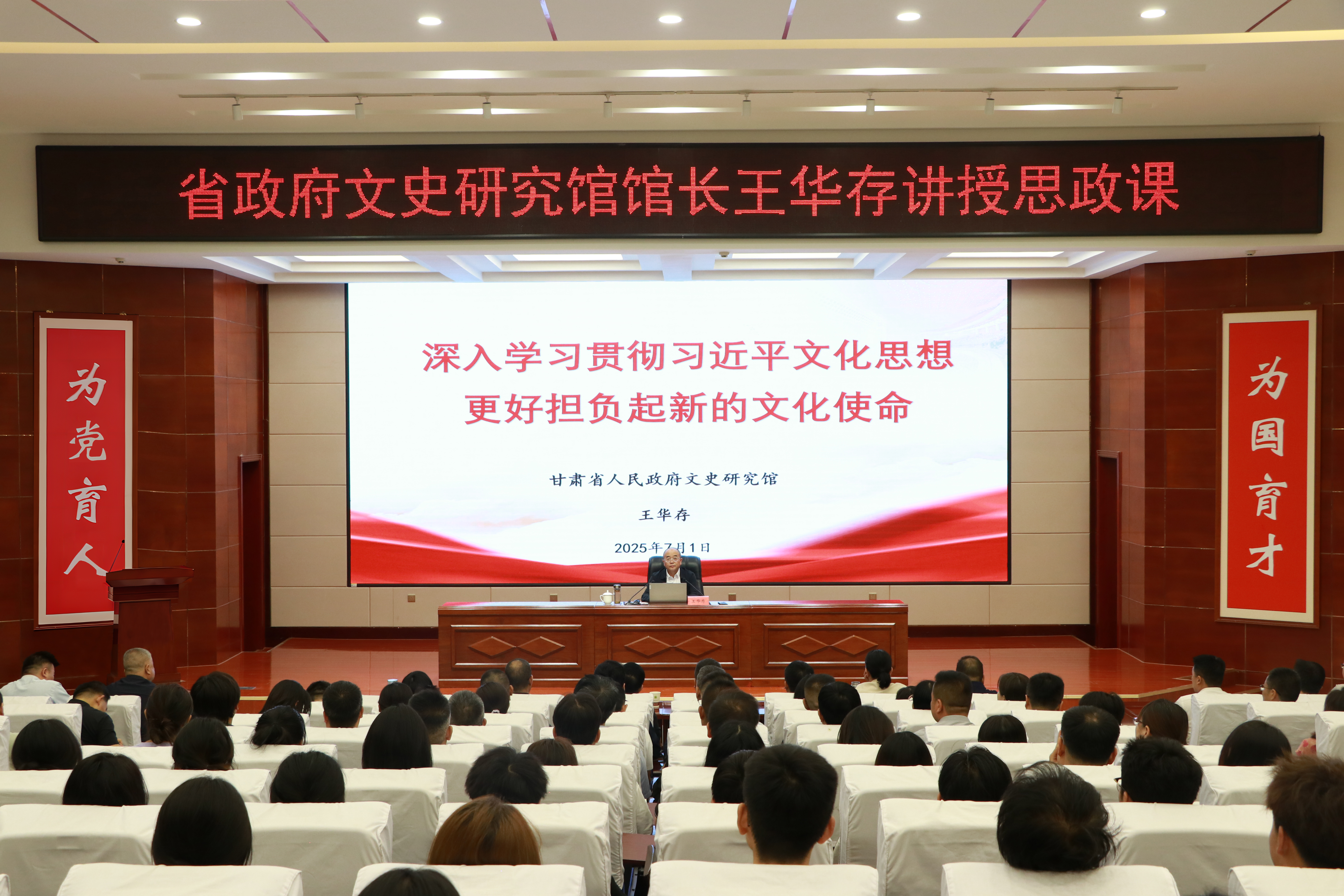 7月1日,在全校上下喜迎中國(guó)共產(chǎn)黨成立104周年之際,甘肅省人民政府文史研究館黨組書記、館長(zhǎng)王華存到學(xué)校為師生講授思想政治理論課。王華存以“深入學(xué)習(xí)貫徹習(xí)近平文化思想 更好擔(dān)負(fù)起新的文化使命”為題,從深刻認(rèn)識(shí)習(xí)近平文化思想的形成過(guò)程、習(xí)近平文化思想的豐富內(nèi)涵和核心要義、甘肅文化歷史簡(jiǎn)述、當(dāng)代青年如何更好擔(dān)當(dāng)起新的文化使命四個(gè)方面對(duì)習(xí)近平文化思想進(jìn)行了全面解讀。黨委書記王宏主持,學(xué)校領(lǐng)導(dǎo)、中層管理干部及師生代表共200余人到場(chǎng)聆聽。