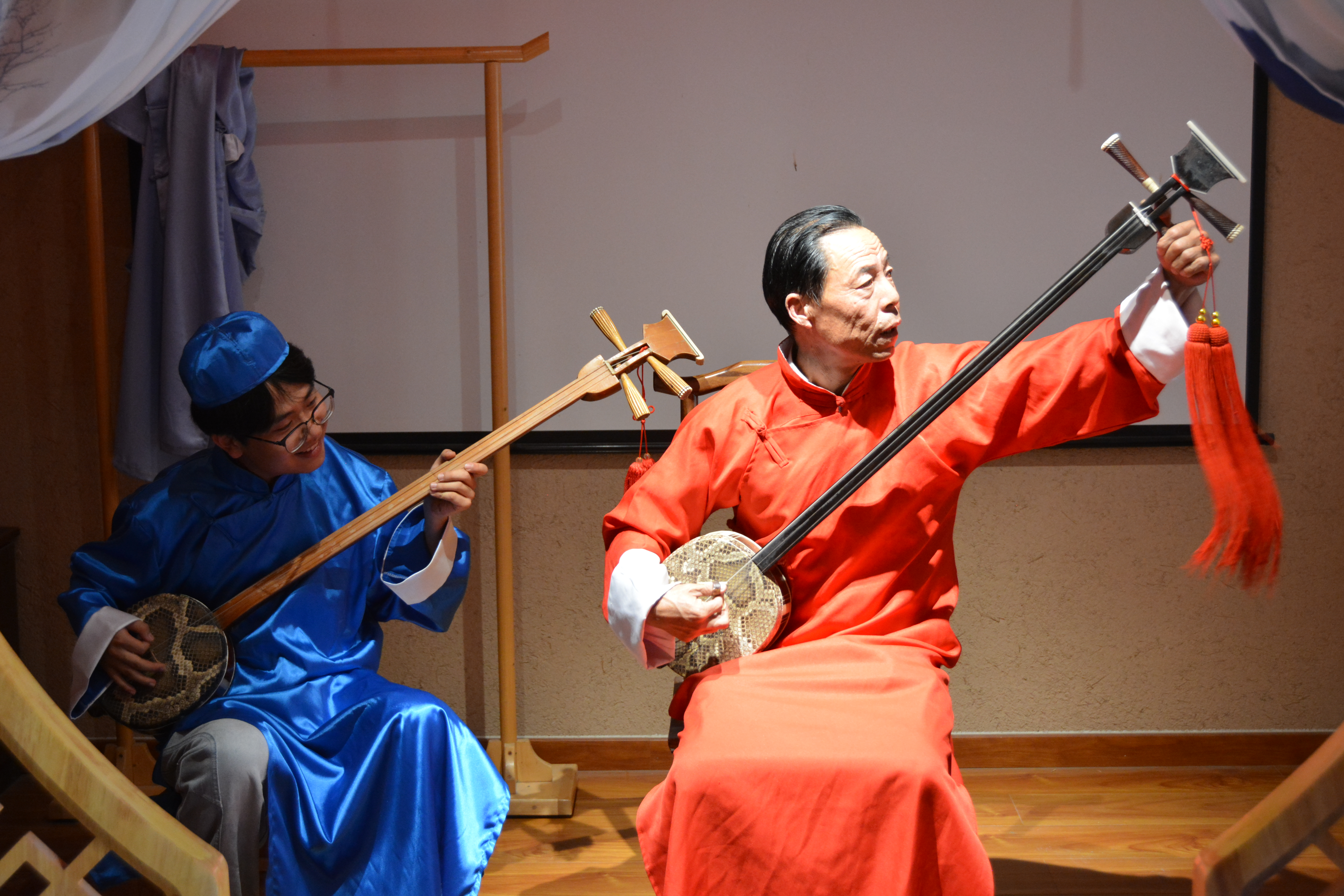 非遺民俗文化館當天化身成為一座流動的非遺課堂,實踐團成員們圍坐在古樸的庭院中,聚精會神地聆聽當?shù)刭Y深賢孝藝人董永虎老師深情演繹的經(jīng)典曲目。老藝人蒼勁而富有穿透力的嗓音,伴著三弦琴弦的顫動,將一段段蘊含忠孝節(jié)義、勸人向善的古老故事娓娓道來。那飽經(jīng)歲月洗禮的曲調(diào),仿佛穿越時空,在青磚黛瓦間回蕩,讓在場的每一位學子都深深沉浸其中,體味著這門古老說唱藝術(shù)所承載的歷史重量與人文溫度。