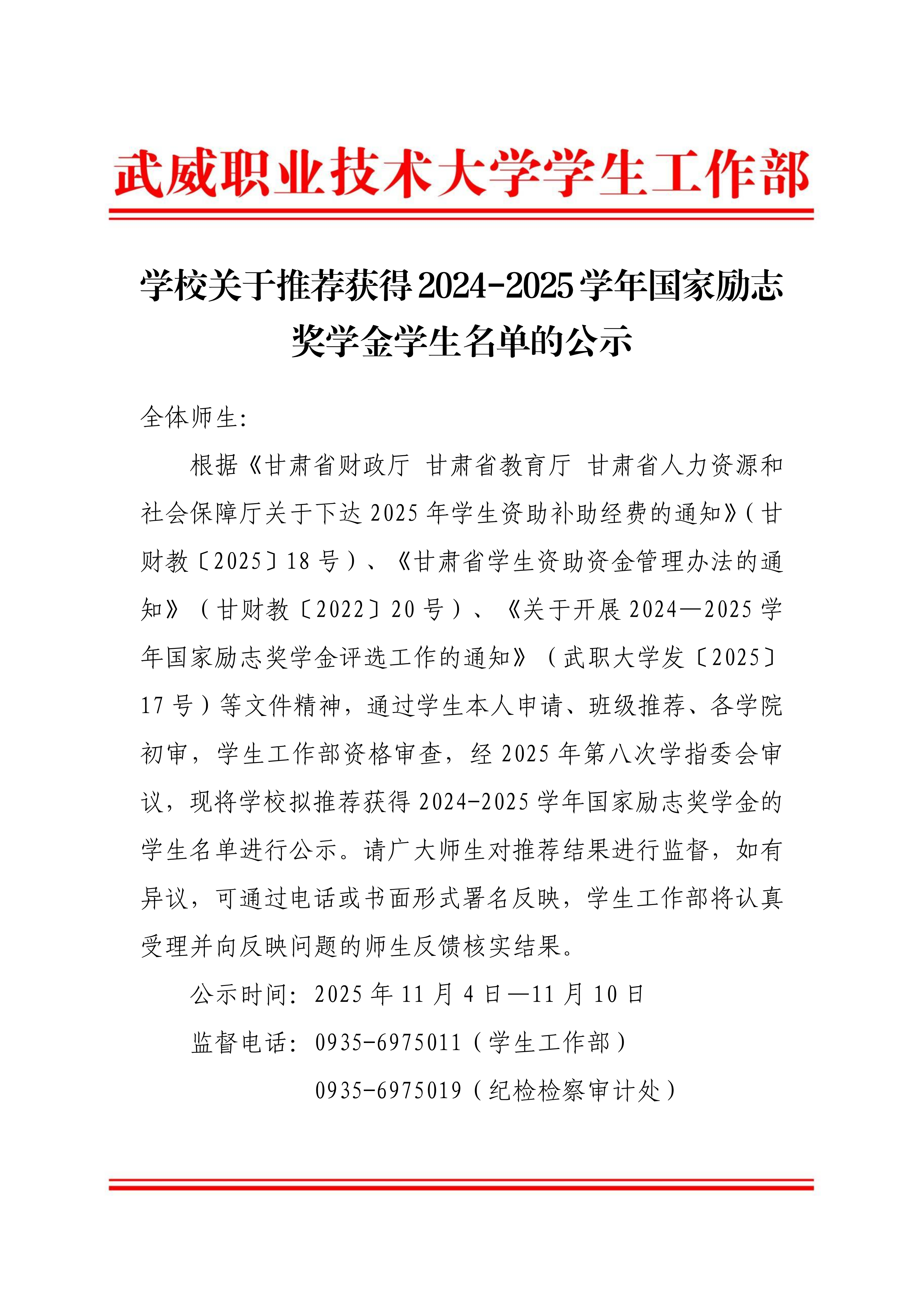 學校關(guān)于推薦獲得2024-2025學年國家勵志獎學金學生名單的公示