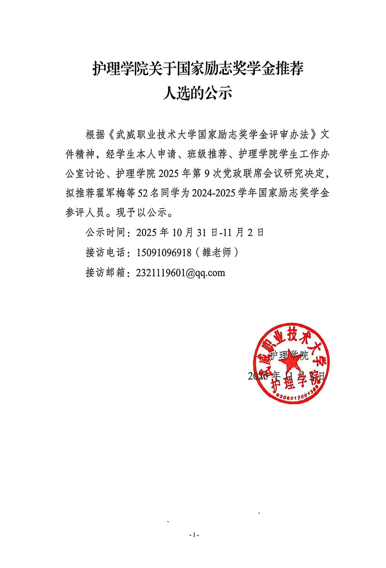 護(hù)理學(xué)院關(guān)于國家勵(lì)志獎(jiǎng)學(xué)金推薦人選的公示