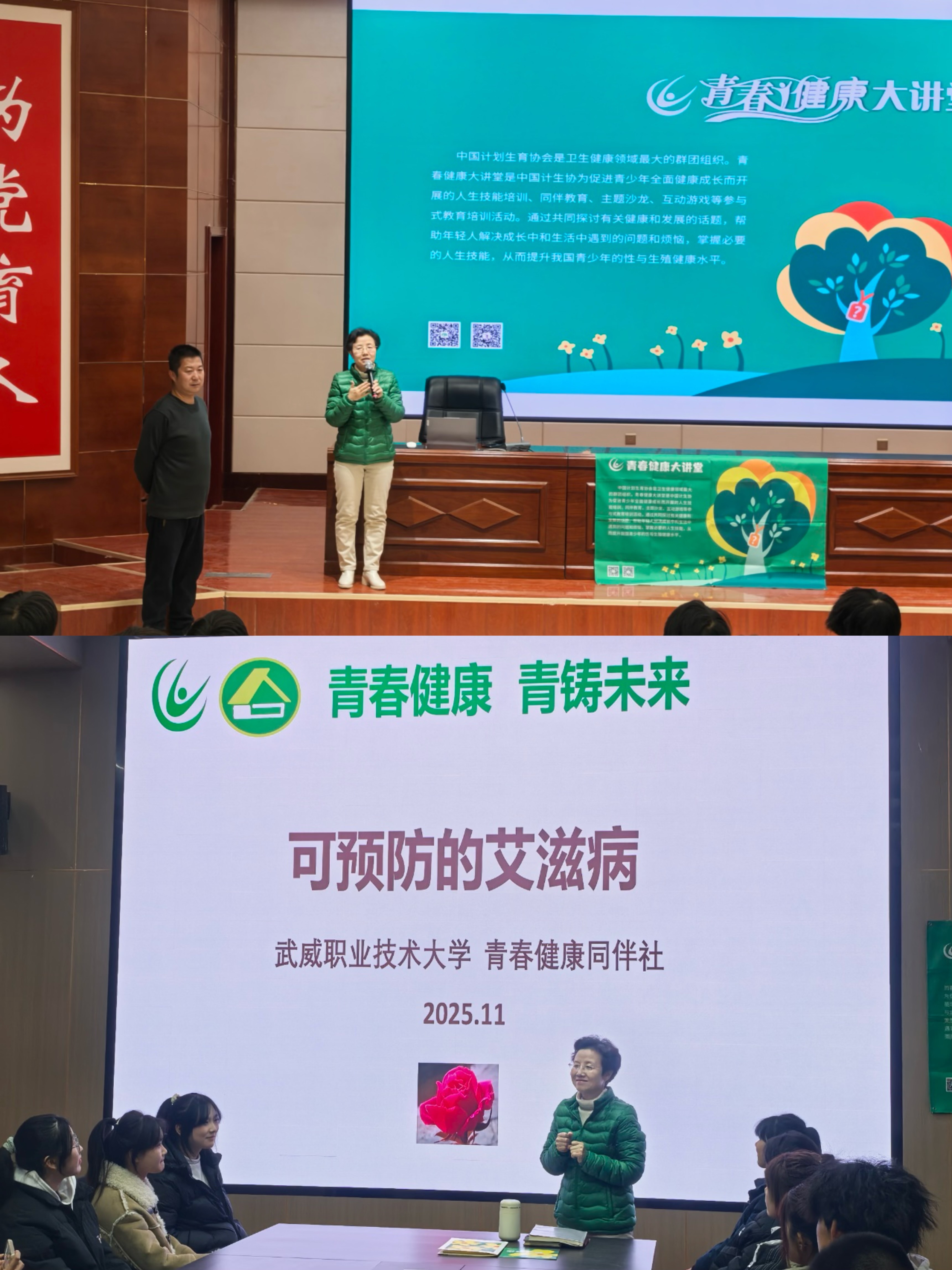 當(dāng)天的主題宣傳活動內(nèi)容豐富,形式多樣?;顒右潦迹爸腊睂n}講座在菁英廳率先開講。講座特邀武威市疾病預(yù)防控制中心艾防科負(fù)責(zé)人王向尚與武威市人民醫(yī)院的皮膚科副主任醫(yī)師李杉擔(dān)任主講嘉賓。專家們結(jié)合一線工作實(shí)際經(jīng)驗(yàn),用翔實(shí)的數(shù)據(jù)和鮮活的案例,生動講解了艾滋病的傳播途徑、預(yù)防措施、流行現(xiàn)狀以及反歧視理念,內(nèi)容深入淺出,貼近學(xué)生實(shí)際,有效幫助大家樹立起正確的防艾觀念,消除對艾滋病感染者的誤解與恐懼。