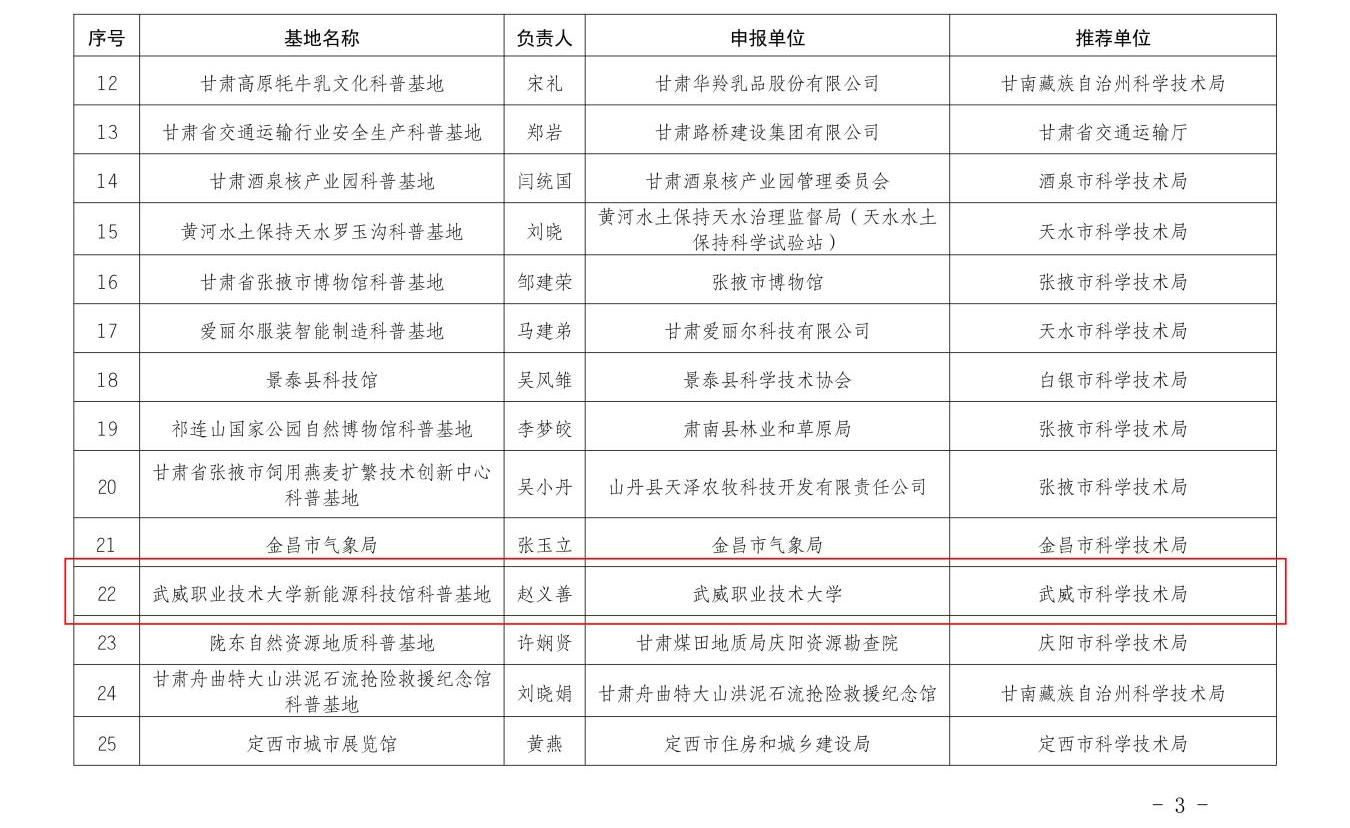為深入貫徹國家創(chuàng)新驅(qū)動發(fā)展戰(zhàn)略,服務(wù)“雙碳”目標(biāo),由武威職業(yè)技術(shù)大學(xué)中科低碳新能源技術(shù)學(xué)院作為主體單位申報、學(xué)??萍继幏e極引導(dǎo)和扶持科普能力建設(shè)的甘肅省“武威職業(yè)技術(shù)大學(xué)新能源科技館科普基地”成功獲批,標(biāo)志著我校在新能源科普教育、科研創(chuàng)新與社會服務(wù)方面邁上新臺階。