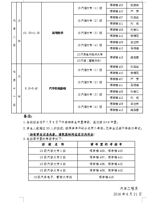 汽車工程系2015-2016學(xué)年第二學(xué)期期末考試實(shí)施方案