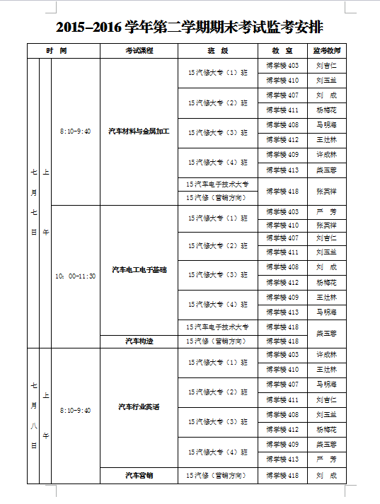 2015-2016學(xué)年第二學(xué)期期末考試監(jiān)考安排