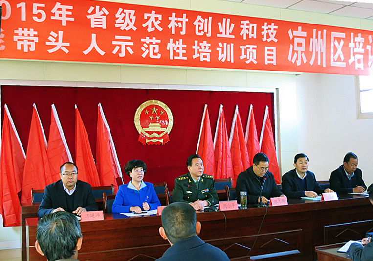 2015年“涼州區(qū)農(nóng)村創(chuàng)業(yè)和技能帶頭人省級示范培訓(xùn)班”于10月28—29日在涼州區(qū)謝河鎮(zhèn)舉行。28日上午,涼州區(qū)副區(qū)長張志殿主持開班儀式,武威市委常委、武威軍分區(qū)政委周小平做了動員講話,學(xué)院副院長潘玉華、區(qū)委組織部副部長、區(qū)人社局局長劉景鵬、副局長沈天舉、謝河鎮(zhèn)黨委書記黨延平、鎮(zhèn)長汪延沛參加了開班儀式。