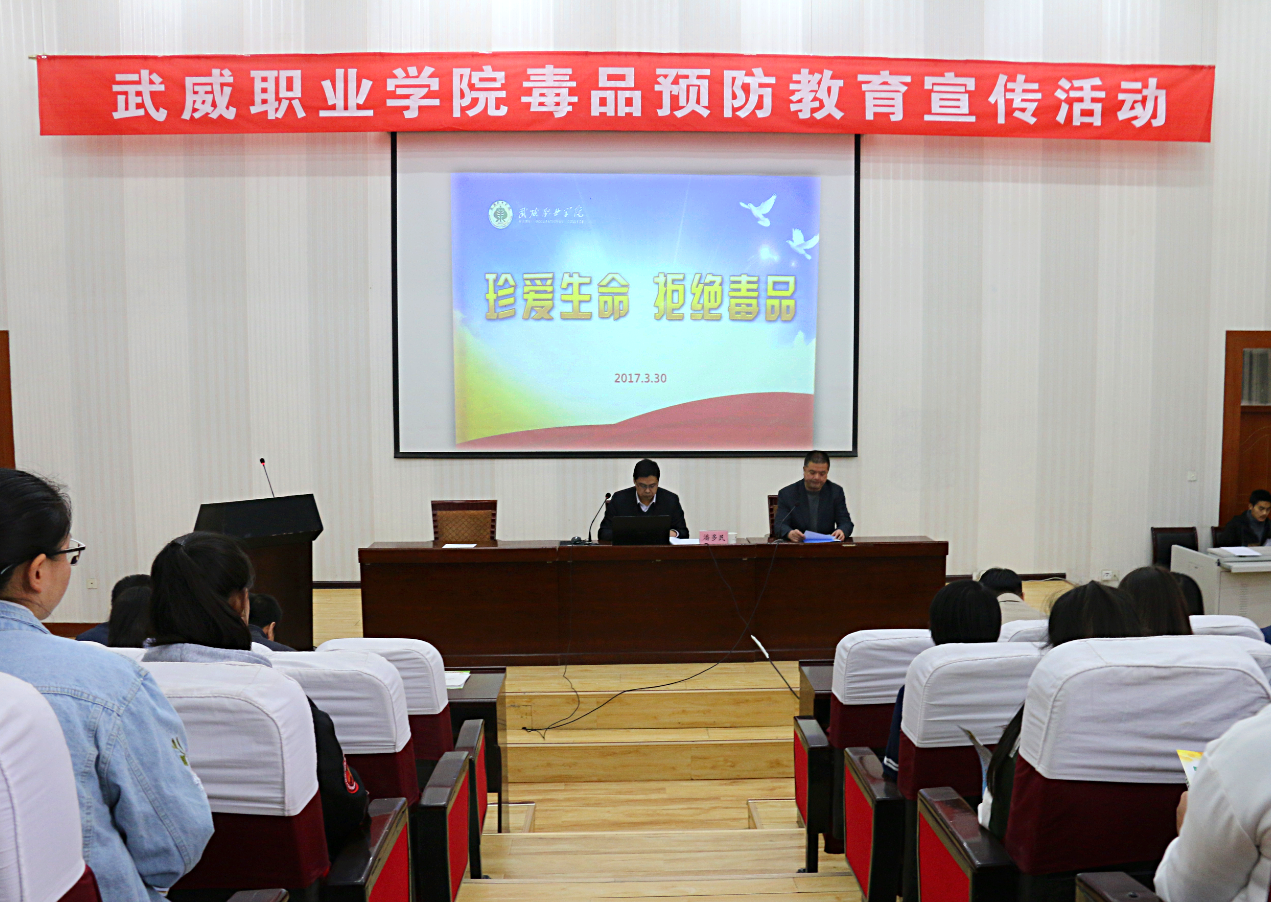 3月30日下午,院團委聯(lián)合學生工作處、保衛(wèi)處在正德廳舉辦武威職業(yè)學院毒品預防教育宣傳活動,團市委書記潘多民出席活動并授課,學院各級團干部270多人參加了活動?;顒佑蓪W生工作處處長王守云主持。