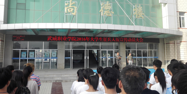 2016年7月5日早晨,學(xué)生工作處聯(lián)合院團(tuán)委在學(xué)院尚德樓北廣場舉行了“武威職業(yè)學(xué)院2016年大學(xué)生應(yīng)征入伍宣傳動(dòng)員大會(huì)”。學(xué)院1000多名學(xué)生和各系輔導(dǎo)員參加了大會(huì),學(xué)院武裝部部長王守云主持動(dòng)員大會(huì)。