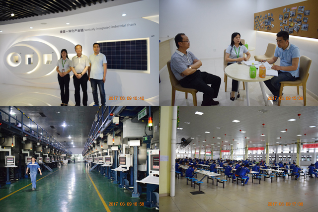 晶科能源控股有限公司是全球?yàn)閿?shù)不多的擁有垂直一體化產(chǎn)業(yè)鏈的光伏制造企業(yè),業(yè)務(wù)涵蓋了優(yōu)質(zhì)的硅錠、硅片、電池片生產(chǎn)、高效單多晶光伏組件制造以及光伏電站建設(shè)等領(lǐng)域,是目前全球光伏組件生產(chǎn)的龍頭企業(yè),2016年中國500強(qiáng)企業(yè)。公司負(fù)責(zé)人帶領(lǐng)考察人員參觀了公司現(xiàn)代化的生產(chǎn)車間、晶科商學(xué)院、員工宿舍和食堂,介紹了公司的發(fā)展情況和用人需求。在考察過程中,考察人員就公司給學(xué)生提供的工作崗位、待遇、住宿、安全管理等情況與企業(yè)負(fù)責(zé)人進(jìn)行了深入交流。