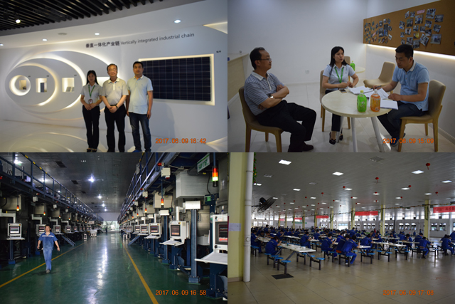 晶科能源控股有限公司是全球?yàn)閿?shù)不多的擁有垂直一體化產(chǎn)業(yè)鏈的光伏制造企業(yè),業(yè)務(wù)涵蓋了優(yōu)質(zhì)的硅錠、硅片、電池片生產(chǎn)、高效單多晶光伏組件制造以及光伏電站建設(shè)等領(lǐng)域,是目前全球光伏組件生產(chǎn)的龍頭企業(yè),2016年中國500強(qiáng)企業(yè)。公司負(fù)責(zé)人帶領(lǐng)考察人員參觀了公司現(xiàn)代化的生產(chǎn)車間、晶科商學(xué)院、員工宿舍和食堂,介紹了公司的發(fā)展情況和用人需求。在考察過程中,考察人員就公司給學(xué)生提供的工作崗位、待遇、住宿、安全管理等情況與企業(yè)負(fù)責(zé)人進(jìn)行了深入交流。