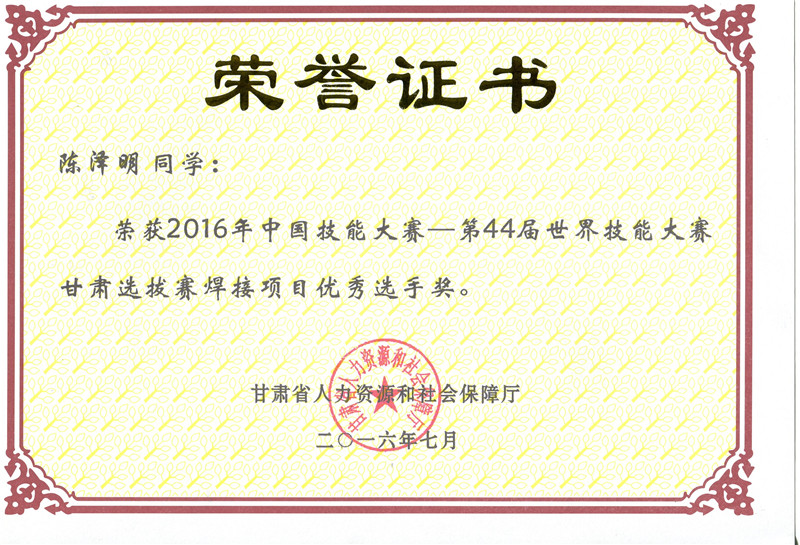 第44屆世界技能大賽甘肅選拔賽焊接項(xiàng)目優(yōu)秀獎