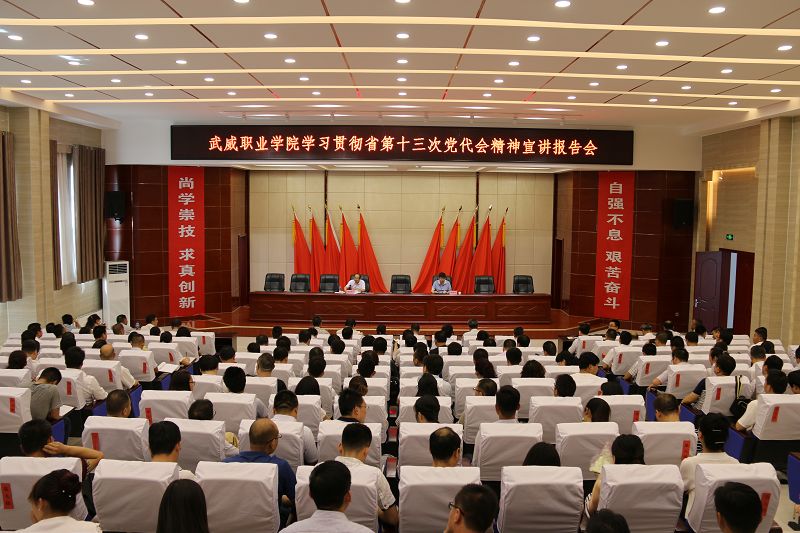 張國(guó)民強(qiáng)調(diào),學(xué)院要把學(xué)習(xí)好、宣傳好、貫徹落實(shí)好省第十三次黨代會(huì)精神作為當(dāng)前首要的政治任務(wù)。廣大黨員和干部師生要努力提高政治站位,切實(shí)把思想和行動(dòng)統(tǒng)一到省第十三次黨代會(huì)的決策部署上來(lái),把黨代會(huì)精神轉(zhuǎn)化為推動(dòng)學(xué)院改革發(fā)展的強(qiáng)大動(dòng)力;學(xué)院各級(jí)黨組織要以此次宣講為契機(jī),在前一階段學(xué)習(xí)的基礎(chǔ)上,繼續(xù)通過(guò)集中學(xué)習(xí)、集中輪訓(xùn)、集體研討、舉辦報(bào)告會(huì)等多種形式, 開(kāi)展深入系統(tǒng)的學(xué)習(xí)研討,營(yíng)造學(xué)習(xí)宣傳貫徹黨代會(huì)精神的濃厚氛圍;要把學(xué)習(xí)貫徹省第十三次黨代會(huì)精神與學(xué)習(xí)貫徹習(xí)近平總書(shū)記系列重要講話精神、黨的十八屆六中全會(huì)精神、全國(guó)高校思想政治工作會(huì)議精神和即將召開(kāi)的黨的十九大精神緊密結(jié)合起來(lái),統(tǒng)籌謀劃,同步推進(jìn);要把學(xué)習(xí)宣傳貫徹省第十三次黨代會(huì)精神與學(xué)院“兩學(xué)一做”學(xué)習(xí)教育常態(tài)化制度化、“三比兩促”主題活動(dòng)、貫徹落實(shí)學(xué)院第一次黨代會(huì)精神、學(xué)院“十三五”發(fā)展規(guī)劃、創(chuàng)建甘肅省優(yōu)質(zhì)高等職業(yè)院校和實(shí)現(xiàn)一流高職院校發(fā)展目標(biāo)緊密結(jié)合起來(lái),靠實(shí)工作責(zé)任,真抓實(shí)干,使學(xué)院在辦學(xué)質(zhì)量、產(chǎn)教融合、招生就業(yè)、服務(wù)社會(huì)等方面全面提升,為全省教育精準(zhǔn)扶貧和建設(shè)幸福美好新甘肅貢獻(xiàn)智慧和力量,以優(yōu)異的成績(jī)迎接黨的十九大勝利召開(kāi)。
