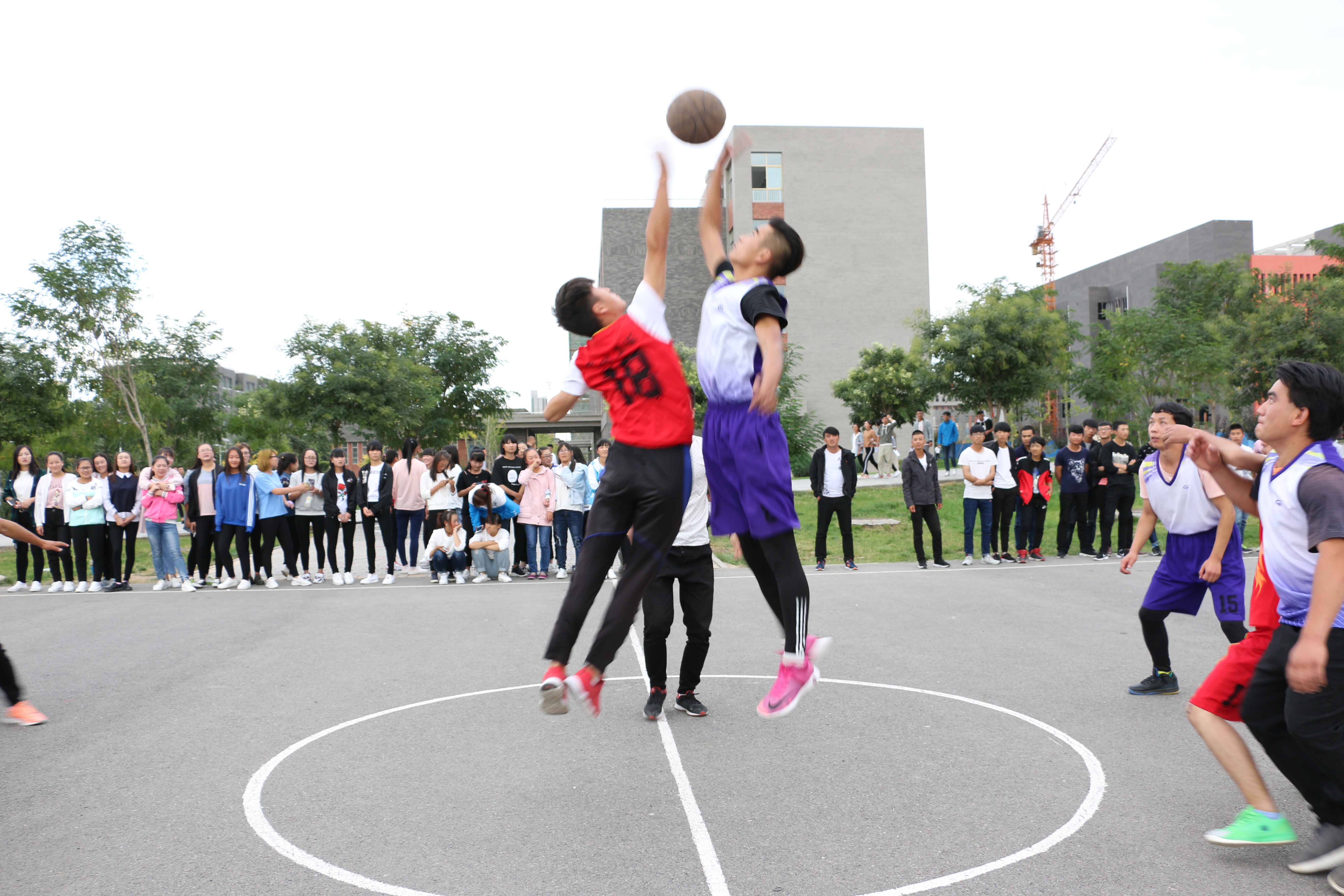 此次比賽有男子籃球、男子排球、女子籃球、女子排球共四各項(xiàng)目。經(jīng)過第一輪的淘汰賽,有八支代表隊(duì)晉級。9月25日下午,晉級的八支代表隊(duì)分別進(jìn)行了男子、女子籃球排球賽的冠亞軍爭奪賽。籃球場上,隨著裁判員一聲哨響并將籃球拋向上空,兩方隊(duì)員奮力躍起,激烈的賽事正式開始。決戰(zhàn)雙方的隊(duì)員斗智斗勇,比分不斷上升,賽事異常激烈,引得全場歡聲雷動。與此同時,排球總決賽也在新排球場上展開。